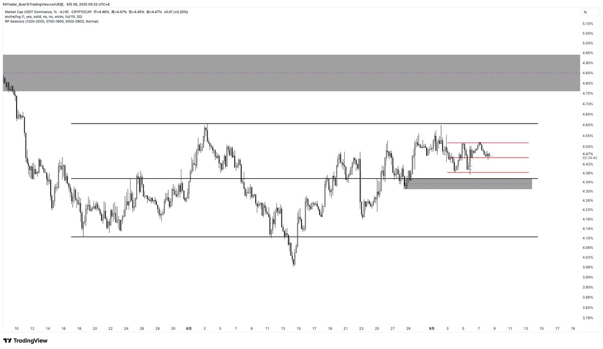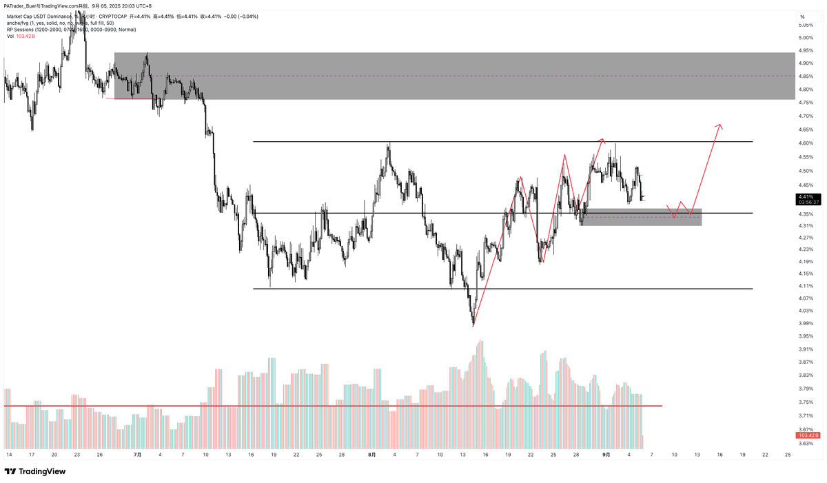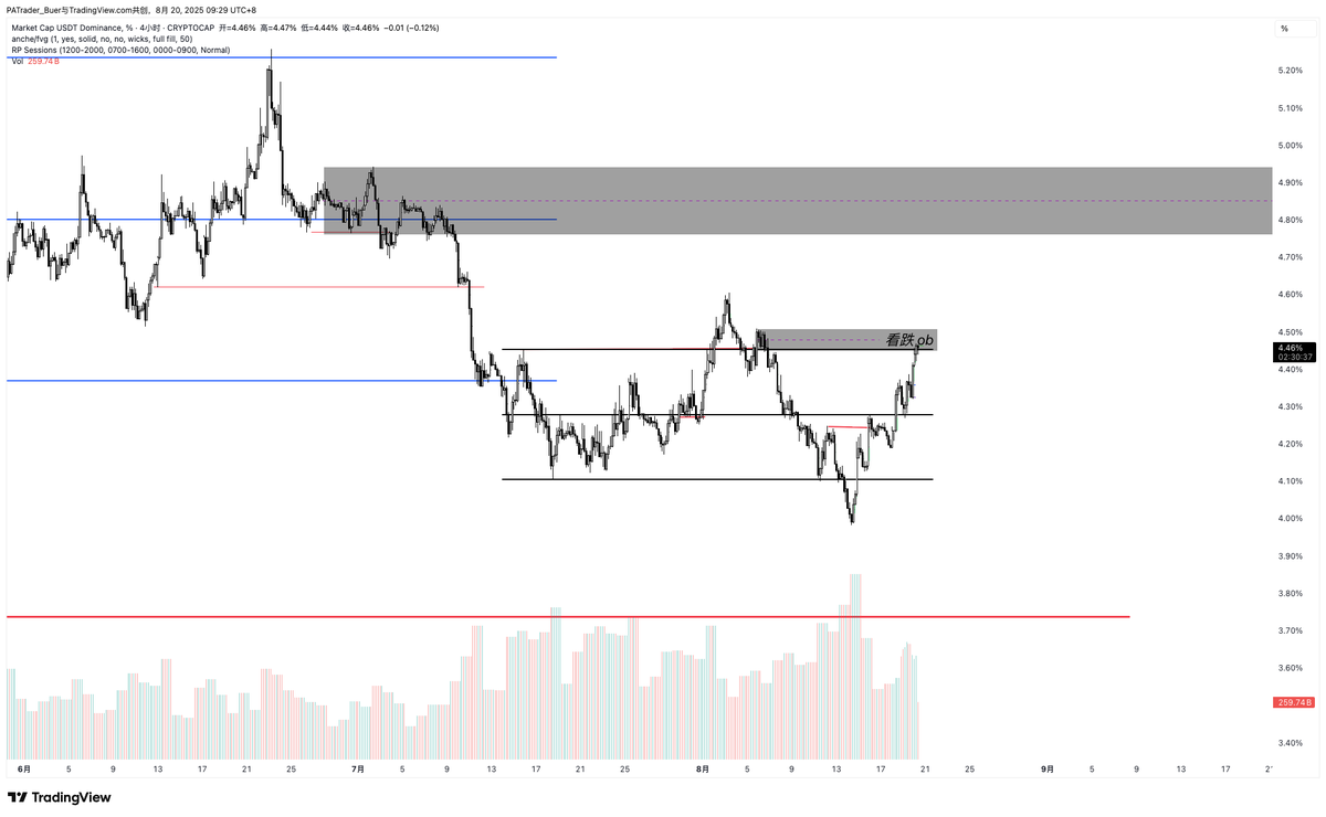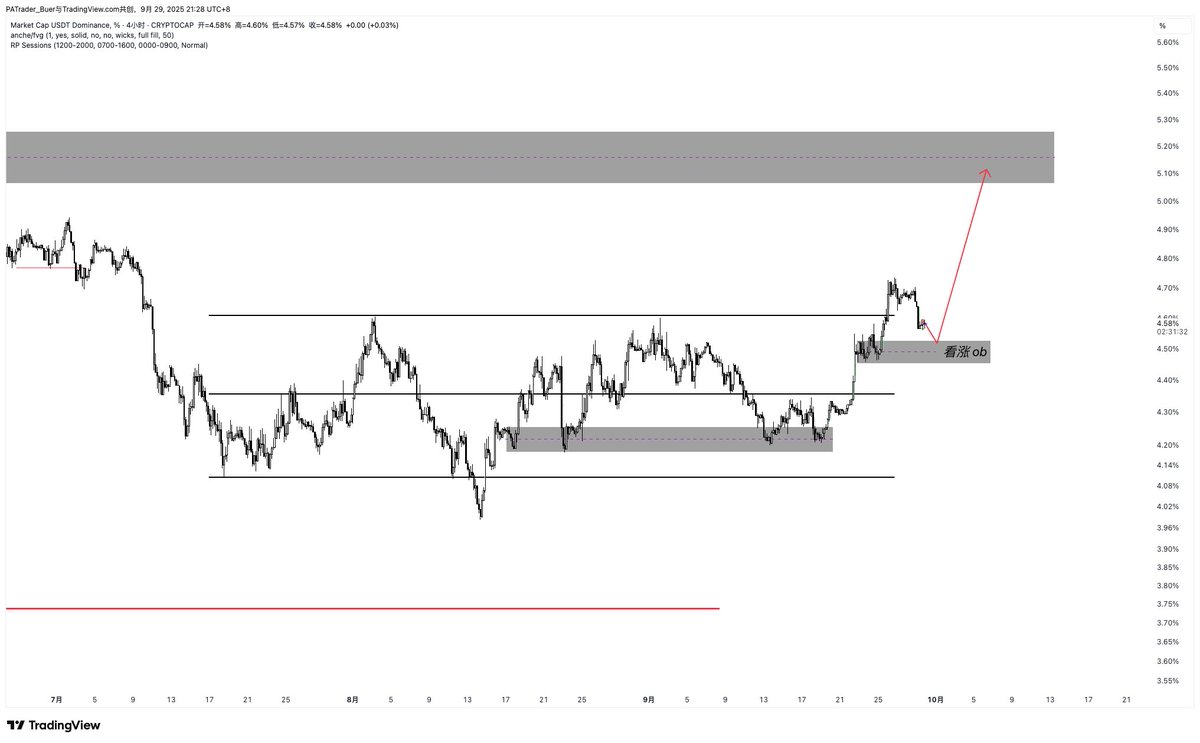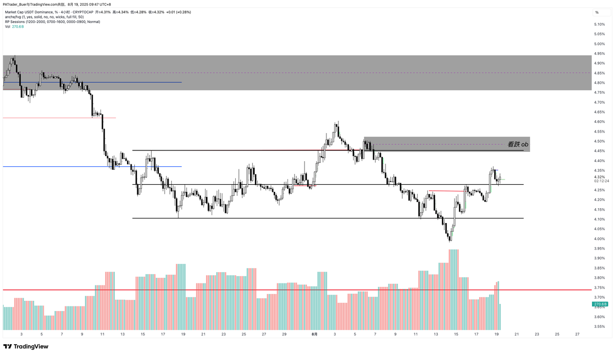 $usdt.d 目前走下跌到了 H4 看涨 ob 了。 这里突破 4.3% 是 msb 。 回继续向上反弹。 所以,今天会是黑色星期一吗?