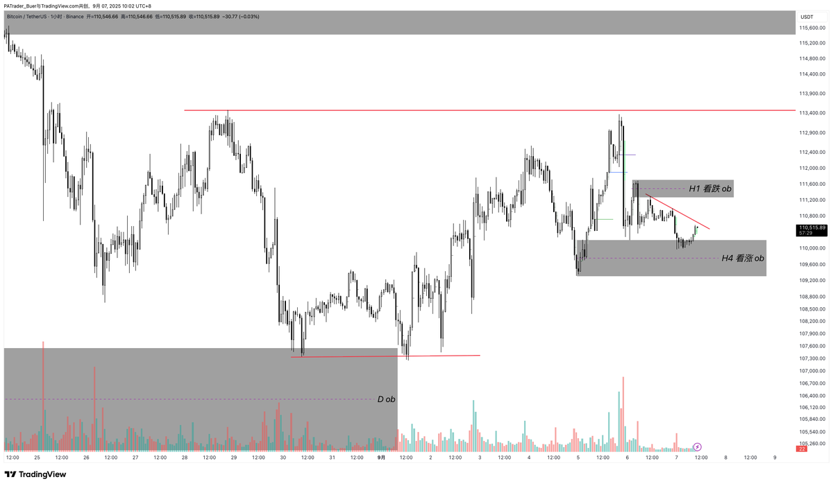 🔥帕尔的 $BTC 行情分析 —— 周报9.8🔥 周线图表 1) K 线结构: 周线向上插针掠夺后, 连跌 3 周,然后上周先打个新低后做个反弹。 所以结构上,目前在走震荡下跌。 2) 流动性: 目前可以上方 1168 位置有周线 fvg 流动性缺口。 一般来讲周线级别流动性缺口会被回补。 下方 105- 98 是周线 级别看涨 ob 。 3) 宏观消息: 9.10 20:30 PPi 9.11 20:30. cpi 目前来讲是依然围绕 降息 和衰退 在操纵 , 关注数据带来导向。 4) 个人观点: 目前来讲是在通过盘整 选择方向。 我个人周线级别方向偏延续目前下跌走势。 现在只不过盘整内容的反弹,流动性获取。 日线图表 1)可以先看昨天日报日线讲的。 2) 目前来讲这里在围绕 1135-1073 盘整。 维持在 eq 上方震荡的话,我们先看对上方eqh + fvg 测试,目标看跌ob 。 但如果跌破且日线在 eq 下方震荡, 那既要注意去测试 107 106 OB。 小时图表 1)周末目前围绕红色 range 震荡,也如昨天说的,测试了H1 看跌 ob. 2) 目前小时级别依然是上涨结构, 只要不破 1092 ,我依然看涨。 3) 这里插针测试 H 1 看跌 ob 后,目前在走一个震荡下跌。 瞎看 对 110 range——l测试, 这里如果能够 站稳, 依然继续向上看,否则继续看对 H1 看涨 ob 测试。 $usdt.d H4 图表 1)这里先看红色 eq 4.45,如果 Eq 站稳,那要继续向上看对红色 range——H 4.52 测试, 4.52 站稳,那就要看黑色 range——H 4.61 了,对应 BTC 要去测试 106 . 那这BTC 剧本就是先跌再涨了。 2) 只要 跌破 4.45 ,期待去测试 4.34 ob ,然后再向上掠夺 4.61 ,看到 4.85 。那是先涨在大跌的剧本。 所以,等吧。