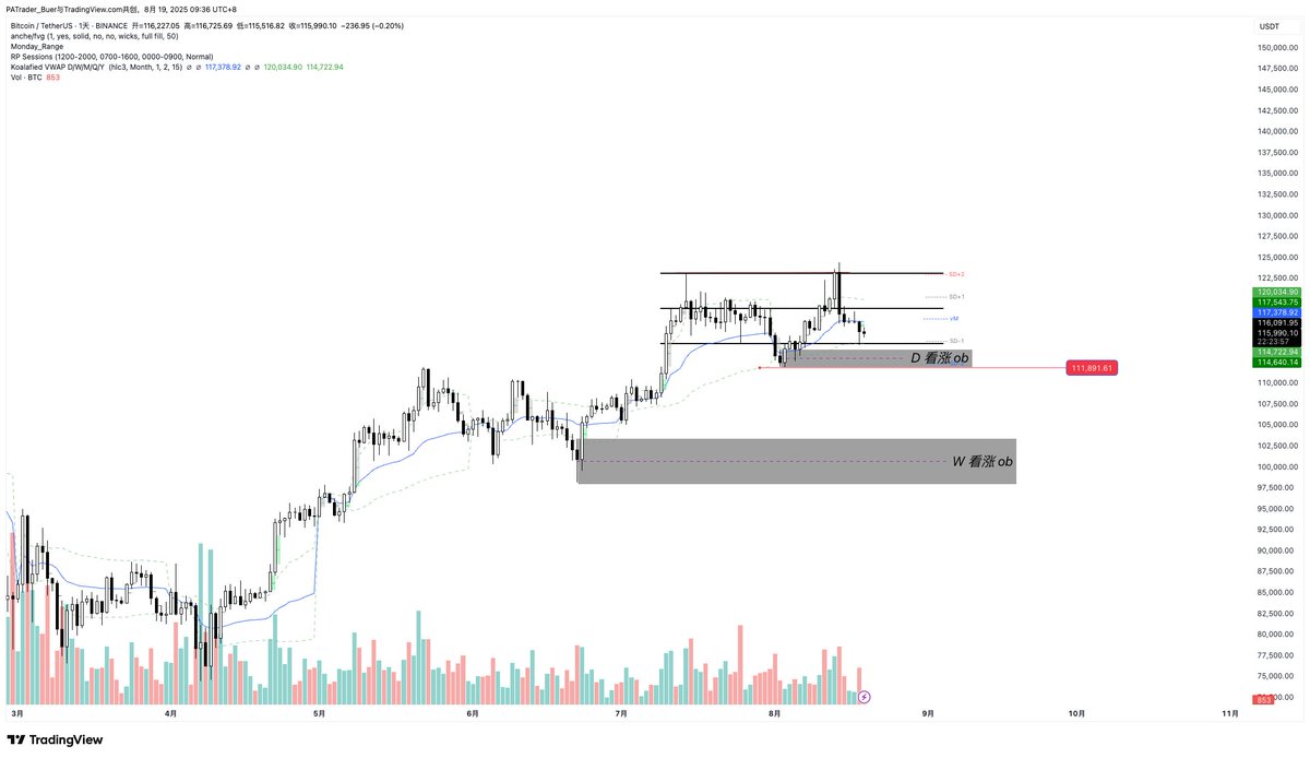 🔥帕尔的 $BTC 行情日报-8.21 日线图标 1)一直强调 13 看涨 ob 是有支撑的, 昨天这里也有了一点反应, 收了个阳 K。 2) 目前来讲还是看这 ob , 1118 这里不破, 那 BTC 日线依然是上涨结构。不过上方要先看 1195位置看跌 ob , 依然是这个位置突破站稳才能继续向上看。 3) 如果 1118 实体跌破, 那 日线结构破坏, 目前 125 就有概率是顶部,下方先看 109 测试,不过目标还是 W 看涨 ob 。 小时图表 1) 这里出现了一个 msb结构, 所以目前来讲我是倾向于看涨的, 止损就是 昨晚低点。 2) 不过明天就是会议, 什么情况不清楚, 而且美股市场目前一直是跌势。 所以没有办法期待什么大的反弹, 只能一点点看, 先看 1155 ,再看1165 ,然后看是否能到 119 . usdt.d 1) 这里也是如期测试看跌 ob 后拒绝向下。 目前来看下方关注 eq 位置 ob ,这里跌不破吸筹,那又要向上反弹, 还是看看跌 ob 测试。 只要跌破 eq 位置 ob ,才能继续看跌。 BTC 也才能继续看涨