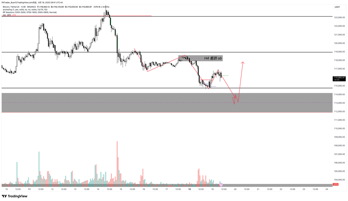 🔥帕尔的 $BTC 行情分析 —— 周报9.15🔥 月线图表 1)月线太大了,除了大佬 和长期主义来讲, 月线只是交易中的一个参考。 2)先说点大的, BTC 突破 7W 后, 已经是另外一个层次了, 我觉得可能不会再见到 7 以下的BTC了。 如果哪天真来个大的黑天鹅插针到 6 附近,那干就行🤣。 所以目前从长远来讲, BTC 跟美股一样走在长牛行情,所以看到的各种大佬猜测到 100W 之类的, 每个人都可以喊, 只是时间问题而已。 3) 抛开想象 信仰 猜测这些长远,回到当下交易来讲,目前BTC 依然处于上涨走势中, 但在各种利好兑现之后, 在没有更多资金流入推动之前, 波动率其实在降低,在一波拉升钱需要进行新一轮的盘整。 4) 所以可以看到目前第三季度 789 三个月一直在围绕 107 -123 震荡,或者可以说 107-116 (实体 K)震荡。 因为本周降息存在, 从月线来讲就是要看能不能站稳 116 ,站稳 116 ,那 有一定概率继续向上去打新高点。 否则来讲, 需要注意回调了(涨不上去的震荡会向下去做进一步流动性获取)。 周线图表 1) K 线结构: 周线向上插针掠夺后, 走震荡下跌后反弹,上周说了 1168 位置周线 fvg 流动性缺口一定会回补,目前已经补完了。 这里现在关键就是 1195 了,这里拒绝 那继续走震荡回调。 下方目标先看下方 105- 98 这是周线级别重要支撑。 如果突破且回来站稳, 那可能就要新高了。 2)本周重点宏观9.18 2:00 美联储利率会议 目前预期来讲是降息 25 个基点。 现在博弈的点一个是 25 还是 50 ,50 是否会引起衰退担忧。 一个是点阵图, 今年还会降低多少。 3) 个人观点: 本周是博弈的一周, 因为上周说的明确流动性目标已经获取了。 现在关键博弈点在 116-1195 ,这是关键位置,关注这里的价格反应。 是直接突破继续新高,还是拒绝下跌。 日线图表 1) 黑色区间是日线震荡区间, 也是本季度行情震荡区间 1073-1233。 2) 可以看到回踩 range——L 构建一个 eql 后,目前向上反弹。 目前行情在 range-eq 这里震荡。 那还是 eq 站稳,我认为会继续向上。 向上先关注目标是 118-1195 这个区间, 然后在向上就是 range—H 123附近了。 如果 eq 这里拒绝向下了 , 那下来先看112 位置 ob 价格反应。 3) 操作建议: 降息前不建议做空 BTC, 你做也就是小短线做波段而已。 降息后,关注 重点位置价格反应再去看是否做空。 目前还是多位置, EQ 位置站稳还是以短多为主。 如果给一个大回调到 112 位置同样还可以关注做多机会。 小时图表 1) 这里反复在讲目前测试 116-1175 H4 看跌ob 后在构建震荡 整个周末就是围绕上边看跌 ob 看涨 ob 震荡。 这里认为不破 115 看涨ob 就是向上看,这是也是上方日线讲的eq 位置。 这里跌破,那就要注意是否会回 112 (目前来看可能不是特别大)。 2) 所以如果 115 位置看涨 ob 不破,那上方看跌 ob 必掠夺,这里构建 4 次流动性了,掠夺后,注意目标到 1195 附近了