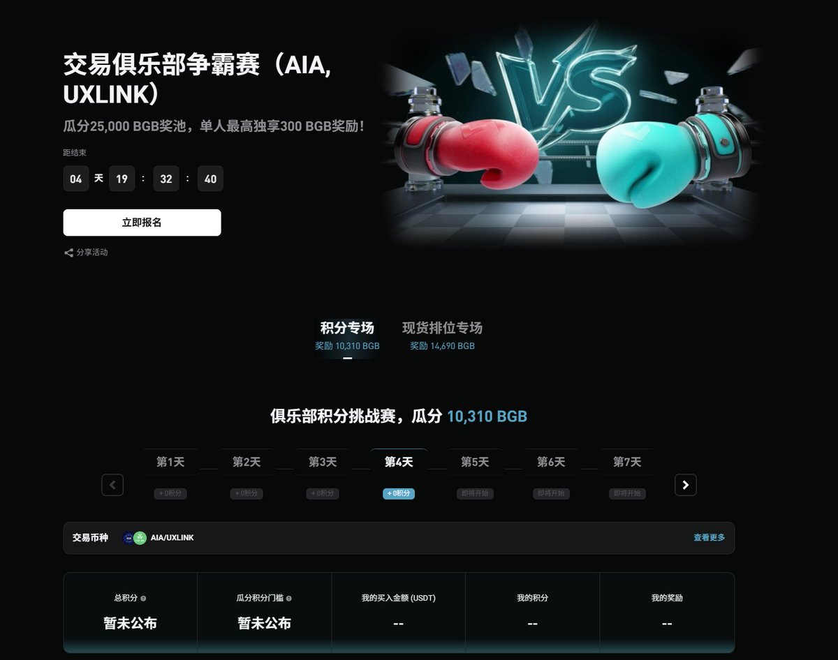 #Bitget 又搞活动了,这次的交易俱乐部锦标赛直接把期待值拉满, $AIA $UXLINK 两个项目一共2.5 万 BGB 奖池