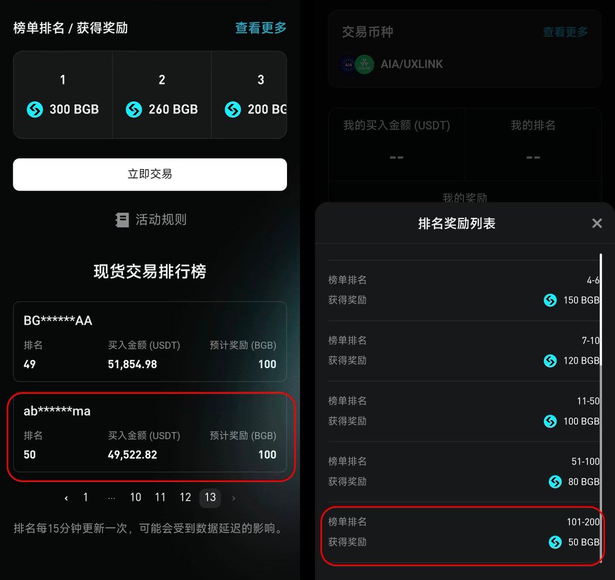 就是这个刷新的太慢了,我交易完成了还是看不到自己的排名,但是看最低是200名,给50 BGB,差不多100多U利润,也美滋滋的!