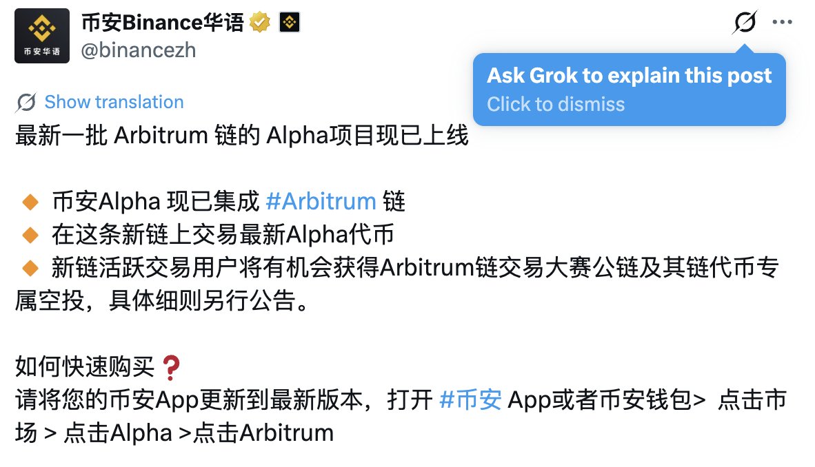 Arbitrum链也迎来了首个在 Binance Alpha 上线的项目