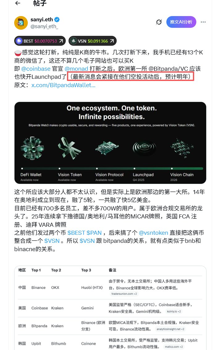 最后提一嘴嘴基本面,@vsntoken 背靠欧洲头牌交易平台 Bitpanda ,底子不错