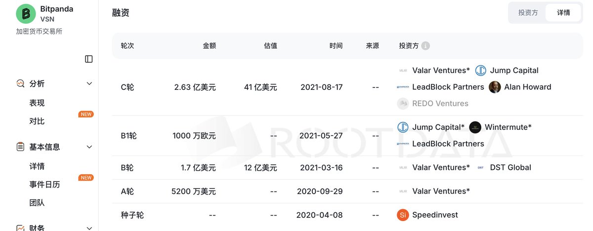 2014 年,在奥地利成立的欧洲老牌交易所,6 轮融资合计 5.9 亿美金,牵头的风投是 Jump Capital、Valar Ventures、Wintermute 这三家最牛的美国机构