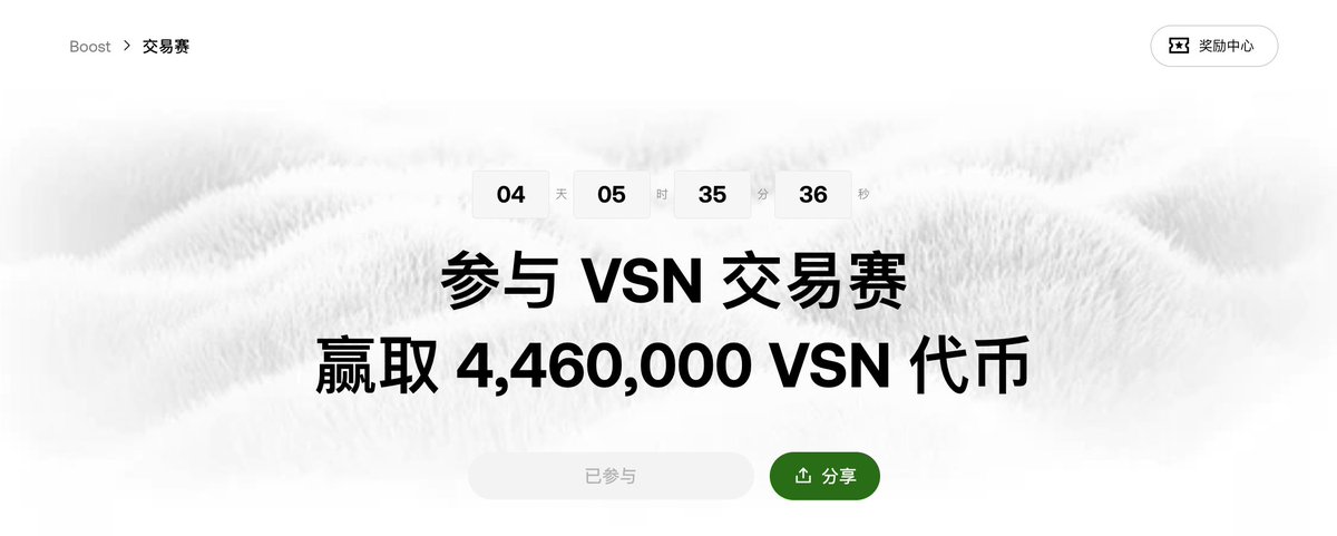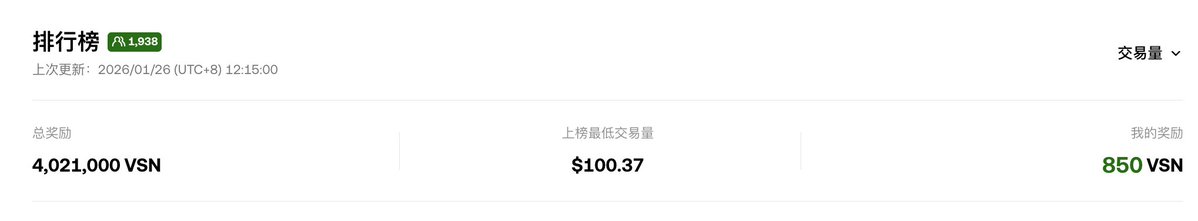 大奖诱惑: 虽然咱们大概率是去分阳光普照奖的,但第一名有 70,000 $VSN ,如果你平时交易量就大,冲一冲榜也不亏。