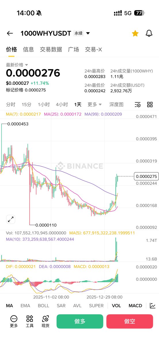 bsc的老币 $why 这个走势看起来很像是趁最近币安链的热度搞事,10m的市值。我看币安广场很多人说空它。说实话这种小盘子狗庄真心要拉起来很容易,千万别乱空。我开了点小倍多单赌一把,带止损。