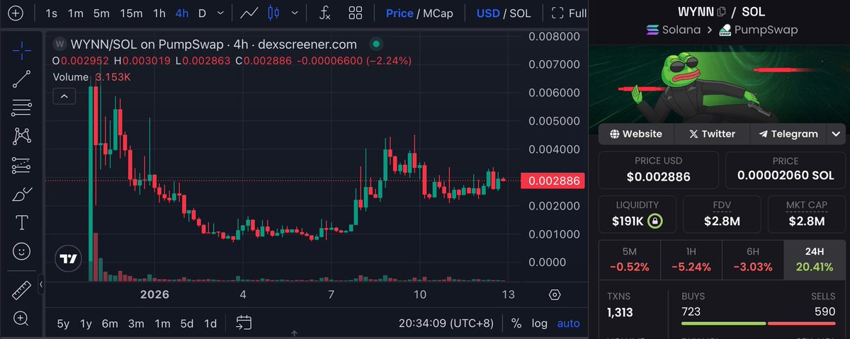距离詹姆斯的同名 Meme $WYNN 发布已有 15 天,这位曾经在 Hyperliquid 开单盈利近 5000 万美元的明星选手,代币表现如何? ▶︎ 市值最高 734 万美元,最低 71.3 万美元,当前 280 万美元 ▶︎ 拉踩 WhiteWhale 10 次,称其同名 Meme 受到热捧非常荒谬 ▶︎ 12.29 发射以来每条推文尾缀均为 WYNN,其中直接提及 CA 7 次 ▶︎ X 社区「The WYNN ARMY!」仅 507 人加入 坐拥 48.7 万粉丝、手握 PEPE 暴富神话、昔日单币交易开出 12 亿美元的传奇开单王,同名 Meme 甚至都上不了 10M 了吗… BTW:WYNN 50% 的代币在 Streamflow 中锁仓,Dev 钱包持有 26.8% 的代币