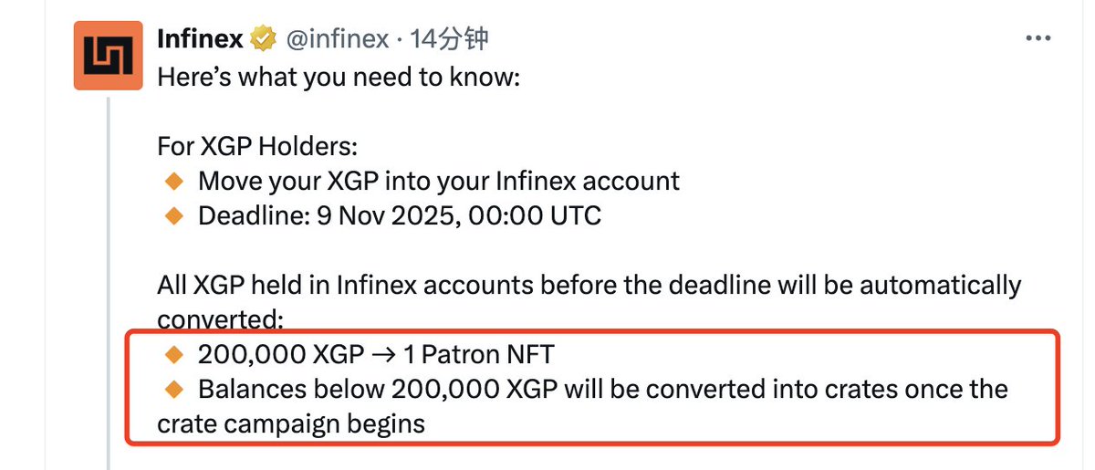 Infinex @infinex 刷着刷着都忘记活跃交互了,大家看看有早期治理代币 $XGP 的记得在11.9之前转到 Infinex 账户(即将下架)