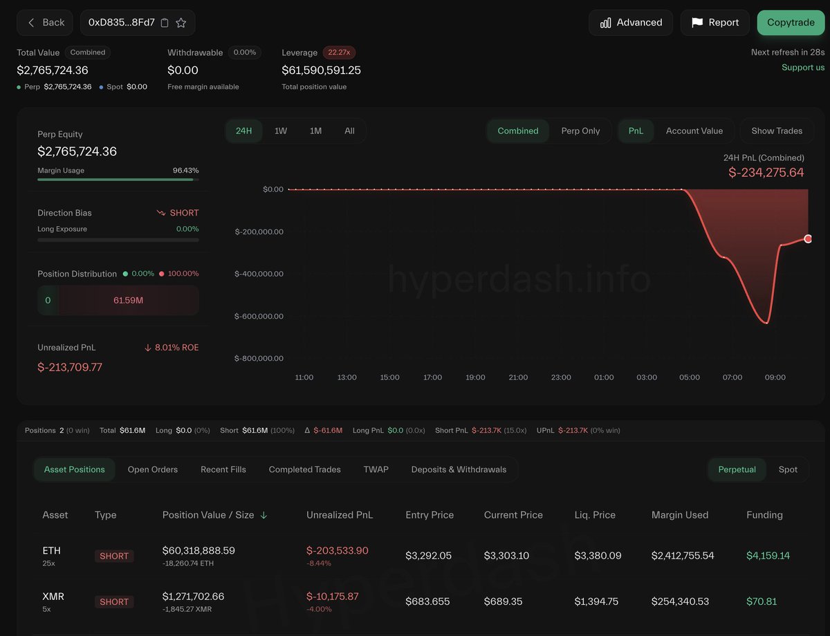 5 days ago, he deposited 3M $USDC into Hyperliquid and went max-leverage short.