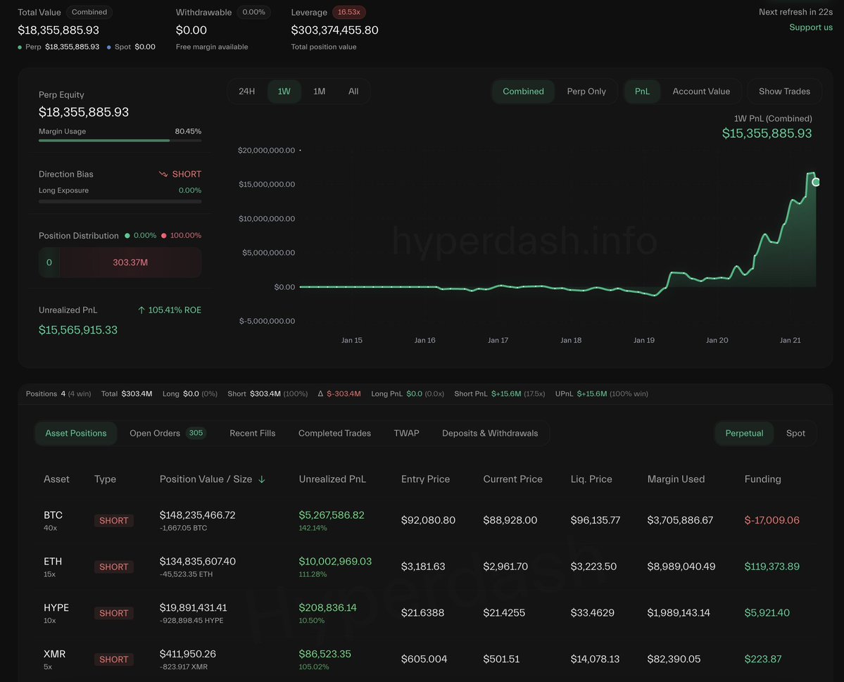 As the market fell, he kept rolling his profits into the position, pushing unrealized PnL above $15.35M.