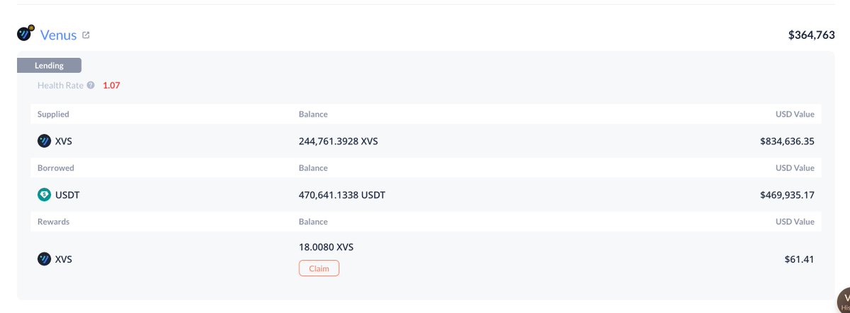 ◎前天他才在 Venus 上抵押 XVS 借出 USDT 并继续购买 XVS,一共是借了 140 万 USDT 买入 53.2 万枚 $XVS ($281 万)。