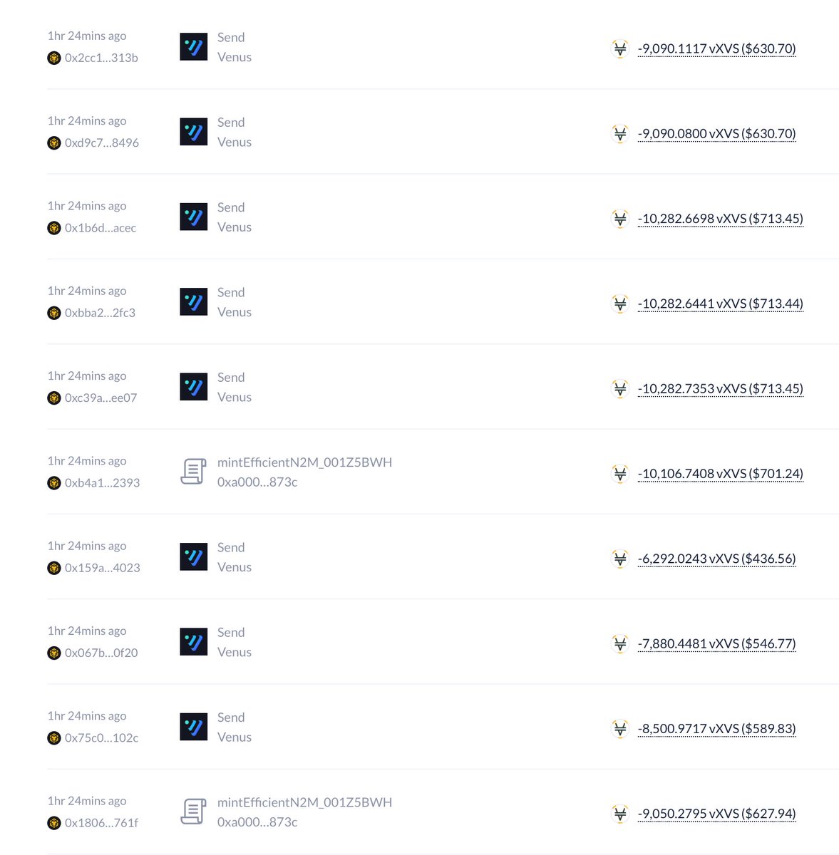 一个前天才在 Venus 上通过循环贷买入 53.2 万枚 $XVS ($281 万) 的鲸鱼,今天在 1 小时前的闪崩下跌中就被清算了 28.7 万枚 XVS ($93 万),亏损高达 $109 万...