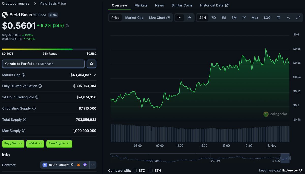 $YB : YieldBasis 宣布并落地 Fee Switch,DAO 将捕获的协议费用分配给 veYB 持有者,首批待分配费用以 BTC 计算。