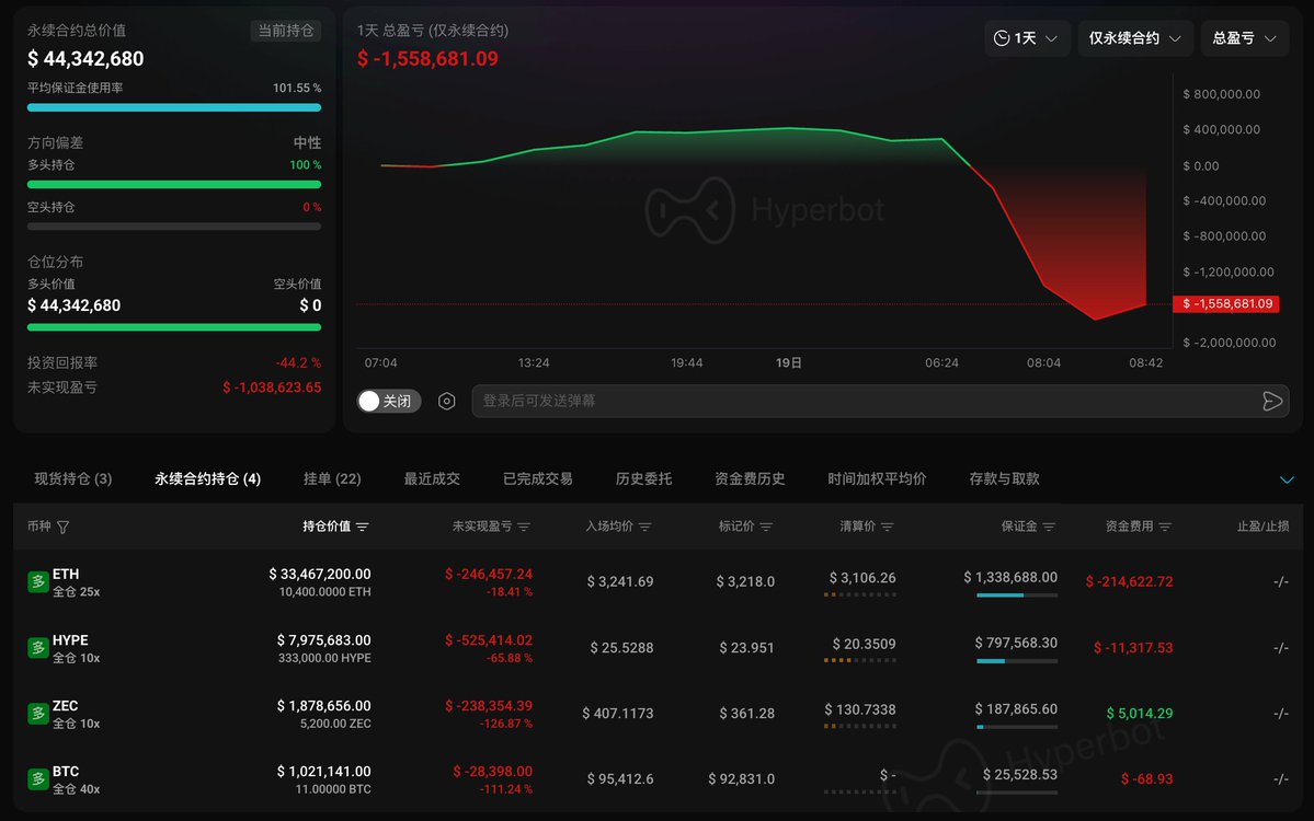 麻吉老哥的仓位再次回到水下,24 小时浮亏 153 万美元,回吐近一周利润🙃