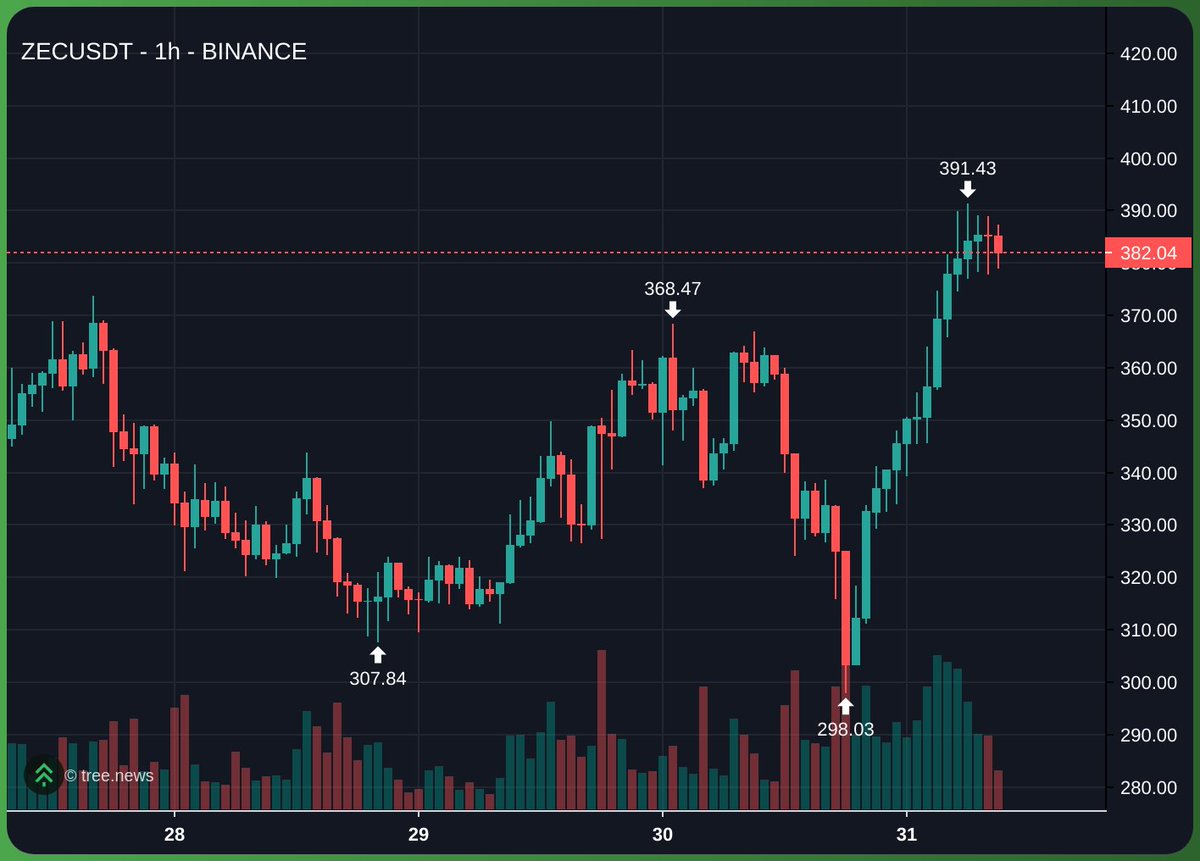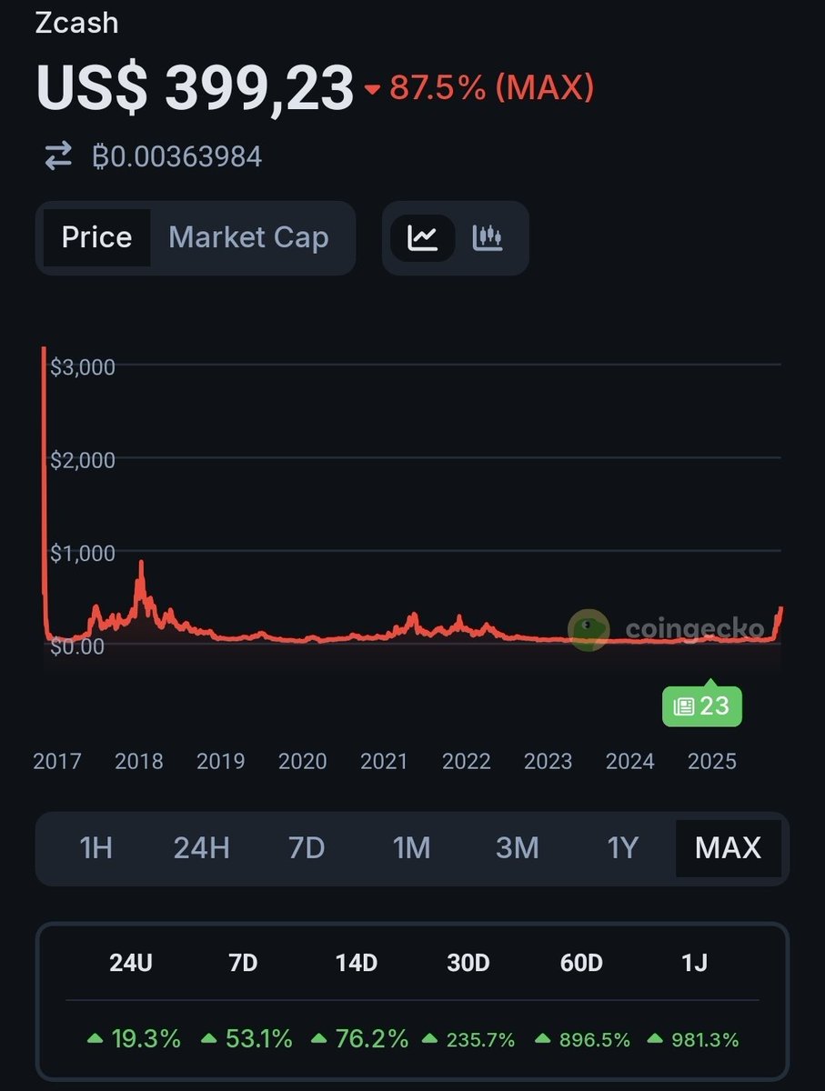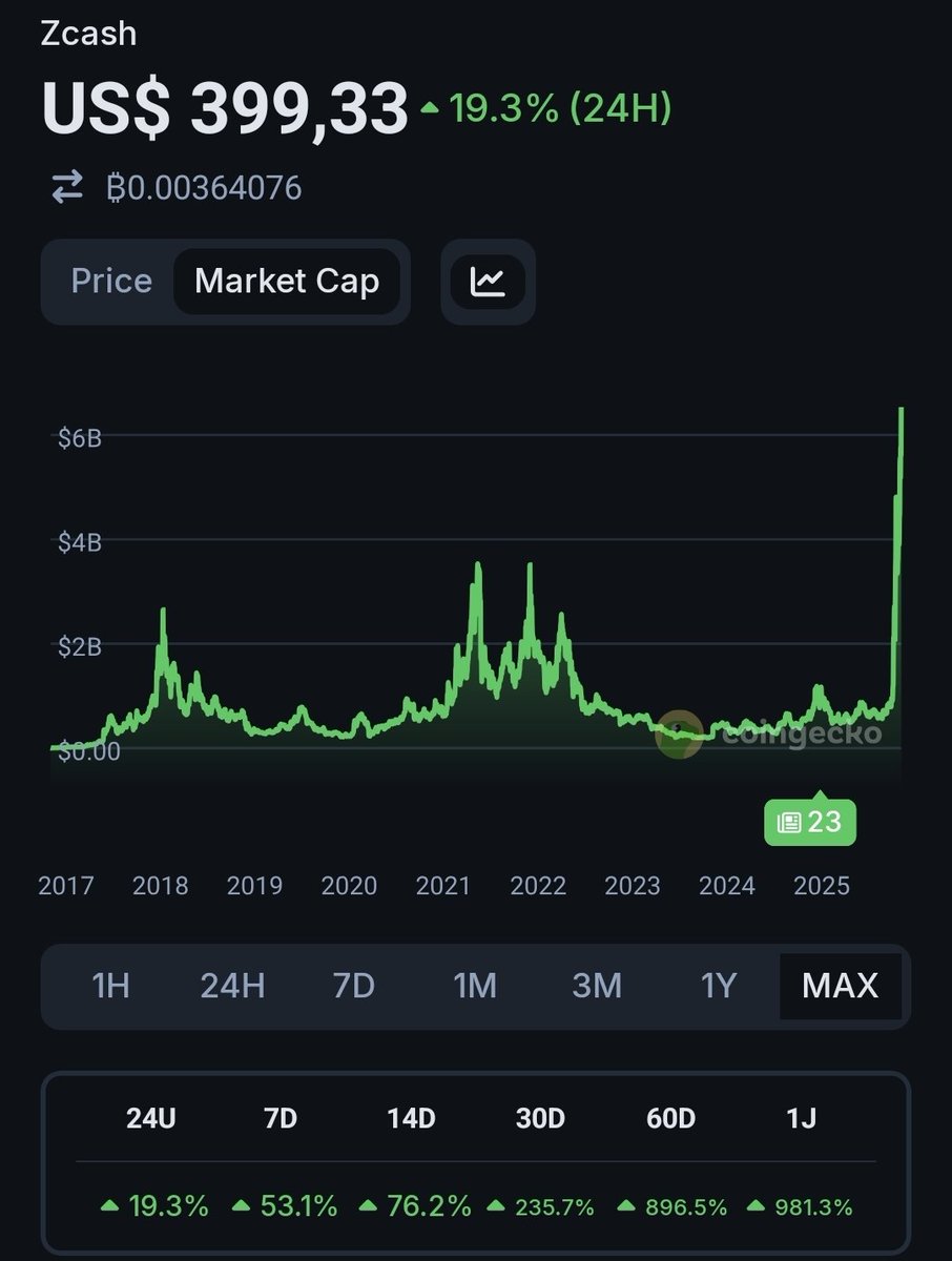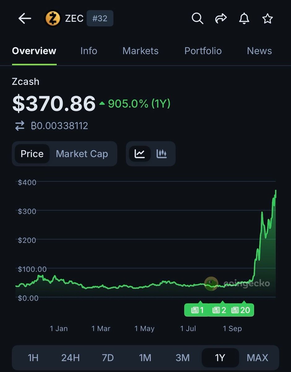 要知道, $ZEC 这一个月已经涨了快 6 倍,从几十美元一路冲到 358 美元。