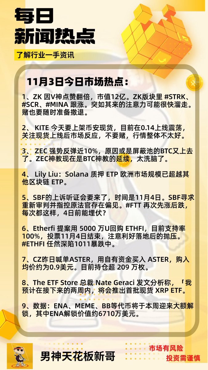 加密早报 * 每日不能错过的重要信息 * 2025年11月3日 1. 特朗普否认已决定对委内瑞拉实施军事打击。原因是上周有媒体报道特朗普政府已决定对委内瑞拉境内军事设施发动攻击,且打击行动可能随时展开; 2. 美联储多名官员反对降息; 达拉斯联储主席洛根认为美联储上周没必要降息,并反对12月再度降息; 堪萨斯城联储主席施密德称上周投票反对降息是担心经济增长和投资会对通胀形成上行压力; 亚特兰大联储博斯蒂克警告市场不要过度超前解读点阵图,12月降息并非既定事项; 克利夫兰联储主席哈玛克称必须维持一定限制性政策力度以使通胀回归目标; 3. CME「美联储观察」:美联储 12 月降息 25 个基点的概率为 69.8%,维持利率不变的概率为 30.2%; 4. 周末 CZ 喊单 $aster ,0.9美金附近直接购买了将近2M的 aster,然后市场直接FOMO,最高到了1.27美金,金主爸爸就是这么有实力; 5. #X402 赛道龙一meme #ping 周末被老外硬是喊起来了,不过现在已经回落到0.52附近了; 6. Cathie Wood 旗下 ARKK 披露前 15 大持仓包括 Coinbase、Circle 等多家加密相关公司; 7. 隐私概念继续起飞,#zec 带头,#zed #dash 等紧跟其后,链上还有 #ghost 等标的; 8. https://t.co/VQD7Tax0bS 过去 24 小时收入达 142 万美元,超越 Hyperliquid 过去 24 小时的 118 万美元收入,仅次于 Tether(2336 万美元)和 Circle(791 万美元); 9. Strategy 创始人 Michael Saylor 再次发布比特币 Tracker 相关信息,等Saylor 买够100万枚比特币,就会变成币圈美联储; 10. Coinbase CEO:x402将使稳定币支付融入任意Web请求,成为新互联网重要组成部分; 11. #Vitalik 持续关注 ZKsync 升级进展,并多次与其互动,称赞 ZKsync 在以太坊生态中做出被低估但有价值的工作。周末 $zk 直接拉了将近2x; 【行情分析】 比特币月线收完了,单从月线来看不太乐观,过去3个月,12万关口上攻了3次,每次都以失败告终,如果月底或者12月再次反弹的话要注意建仓或者格外关注; 4小时级别比特币进入宽幅震荡走势,上下10000点的振幅,现在市场多空分歧较大,不过依然维持此前的判断,11、12月会有一波行情,至于这一波是突破还是反弹,到时候再看; 本轮最大的创新或者叙事就是预测以及AI(agent&x402),所以我觉得接下来精力重点放在这两个板块没啥问题,重点研究x402赛道的infra吧,预测市场重点关注前5个项目就行; 【风险提醒】 数字资产波动较大,风险极高,请谨慎参与,杜绝满仓梭哈,拒绝贷款杠杆;