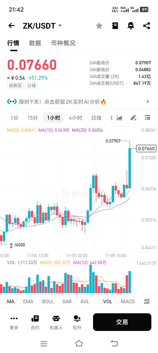 奈斯呀,这个 $Zk 0.033-0.0485了,牛逼,看这次你能拉多少! 刚突然看到这个 $Coai 跌这么多,1.42买了一点,博反弹?