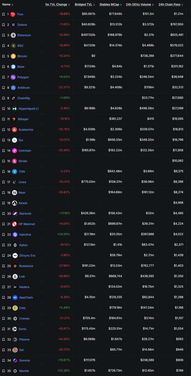 目前币圈公链24小时收入榜 收入最高的TRON$1.2M SOL $767K ERC $631k BSC $576k 至于那些曾经的天王级公链 $STRK $ZK 收入只有 $4K 和 $1.4K $SEI $SCROLL $CHZ 连 $1K 都摸不到 $FIL 和 $ZETA 收入只有 $63 和 $17 现在只剩回购+销毁才能 延缓归零公链的死亡了
