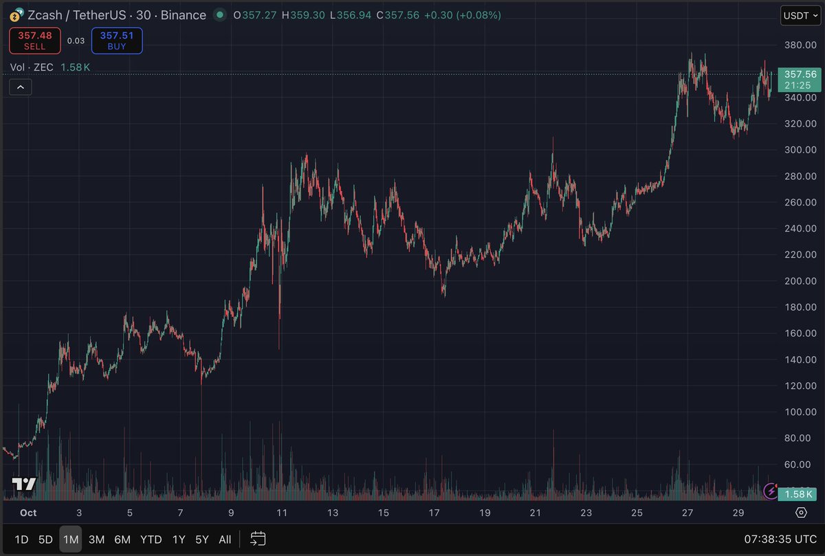 要知道, $ZEC  这一个月已经涨了快 6 倍,从几十美元一路冲到 358 美元。
