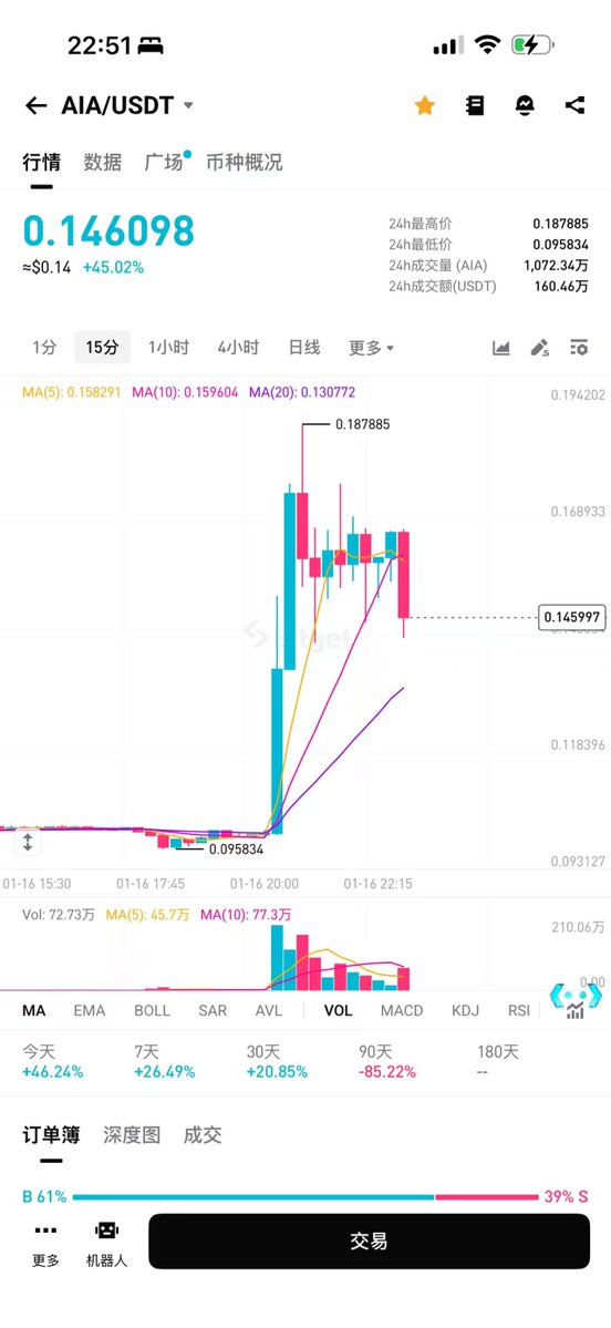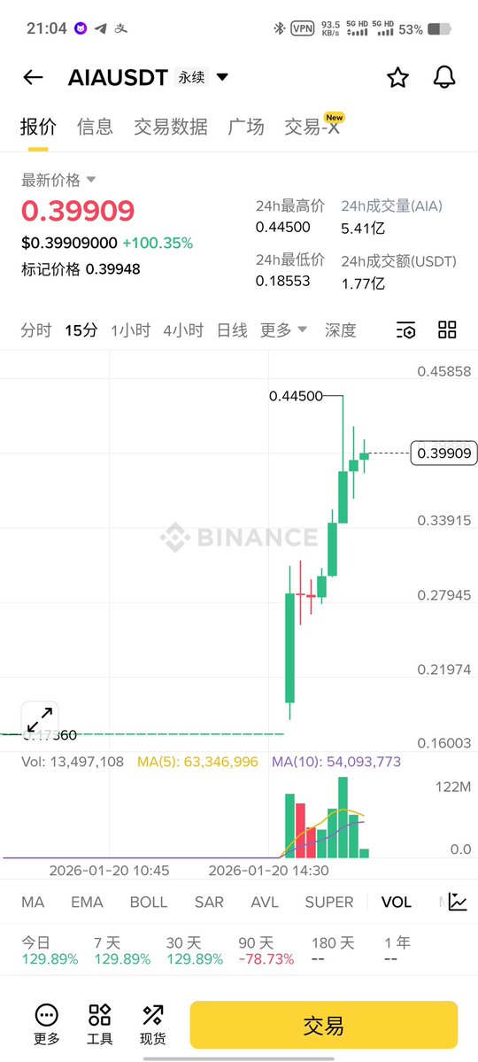 我昨天还在说感觉 $AIA 要起飞,今天是真的拉伸了一波,原来是因为 $AIA 重新返回了币安合约。