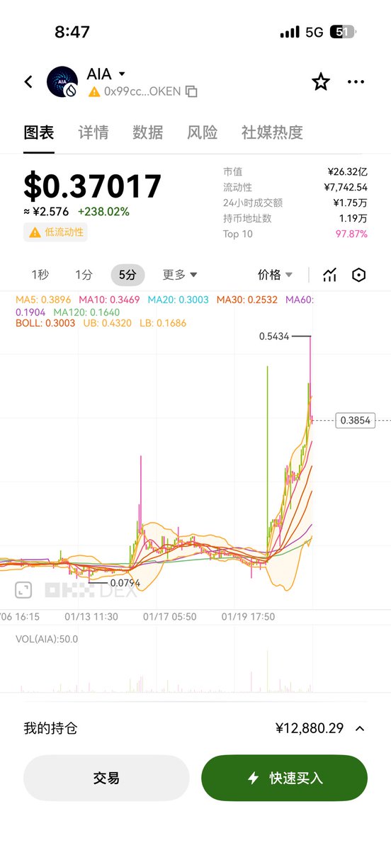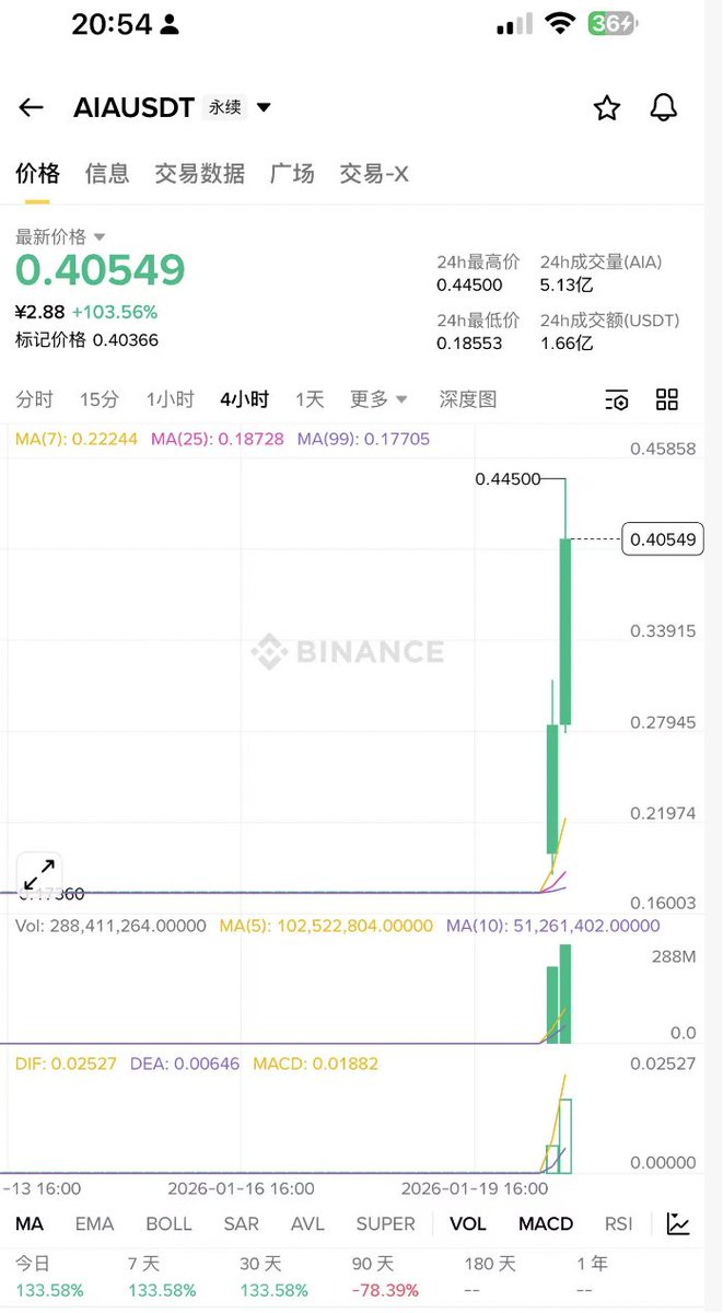 $AIA 今天成为热点主要源于其重新上线币安合约,这一罕见操作被视为“重生题材”,直接刺激价格短时间内暴涨230%-400%,引发市场关注。代币本身具有历史妖币属性(曾从$1拉至$48),叠加项目作为Sui生态重要AI基础设施的背景,持续的技术迭代与高波动性吸引了投机资金和话题热度,推动交易活跃度骤增。