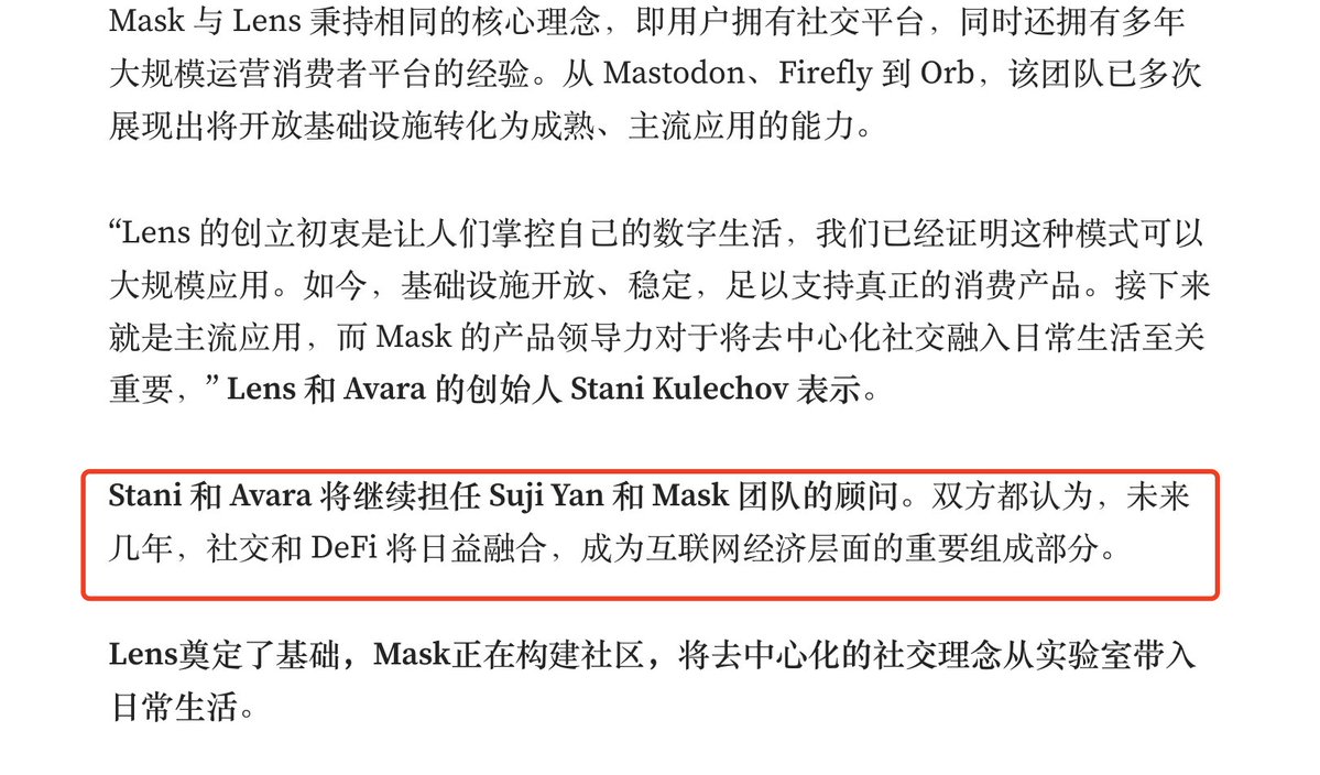 看了下文章大致意思是Mask 成为 Lens 新的管理者,未来 Lens 重点不再是协议实验,而是面向消费者的用户体验、产品设计和全球分发。