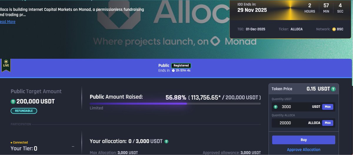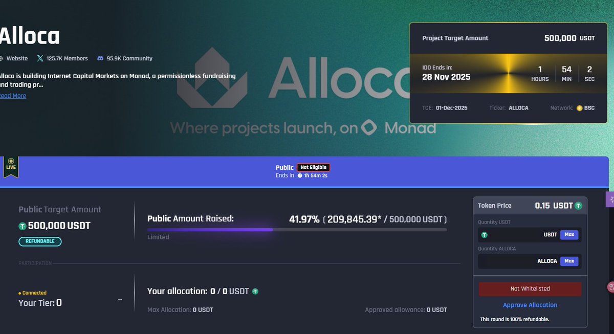 Monad 今晚有个IDO项目 Alloca, 他们在做的是在 Monad 上搭一个链上资本市场。@alloca_xyz 就是让项目可以公平启动、让用户随时交易, 而且全程都不用把资产交出去,始终自托管。 不管是 Meme 还是 DeFi,项目方都能在 Alloca 上做发行,用户也能直接参与和交易。 这种模式在 Monad 生态里算是缺口比较大、但需求很明确的基础设施。他们晚上会在在 Seedify 做 IDO。 保证轮(GTD) 11 月 28 日 18:00 → 24:00 先到先得(FCFS) 11 月 29 日 01:00 → 03:00