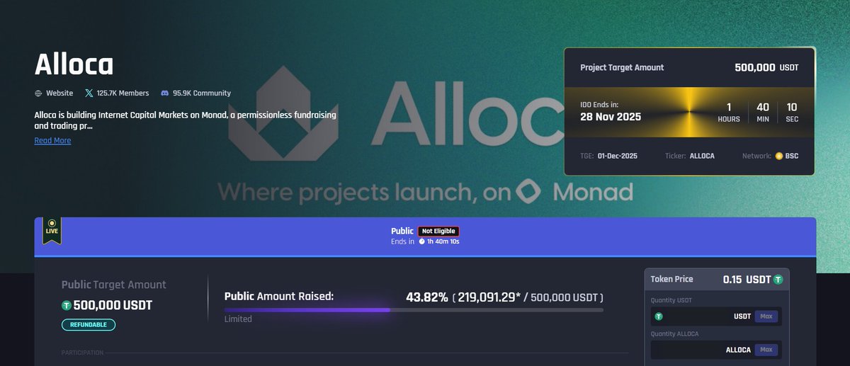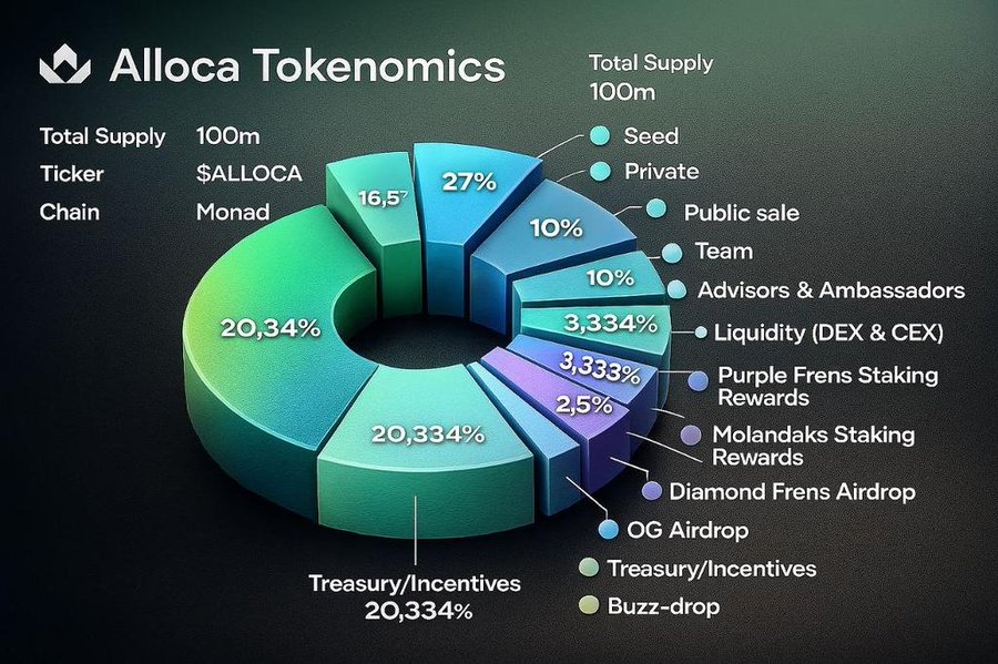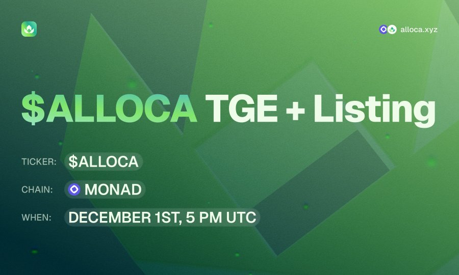 有时候会觉得,自己在这个市场里的身份在切换:一会儿是旁观者,一会儿又变成了真正参与规则重写的那一批人。看到 @alloca_xyz 在 Monad 上的推进,就是这种感觉又被拉了回来——原来我们真有机会站在「链上资本市场」开局点上。 回到正题,先把关键信息说清楚: 🔹Alloca 在做什么? 🔸建的是 Monad 上的「无许可链上资本市场」,不管是 Meme、DeFi 还是其他资产, 🔸都可以在 Alloca 上完成:发行 → 定价 → 交易 → 融资,全过程自托管,资金不进黑箱。 🔹采用 Bonding Curve 机制: 🔸启动即有流动性 🔸价格随买卖实时变化 🔸筹资规模、估值、持仓,全都链上透明 🔹收益模型非常直接: 🔸100% 协议净收入回购 $ALLOCA 🔸2.5% 代币作为质押奖励,长期反哺持有者 与 Monad 强绑定,未来 Monad 生态的项目想公平发行、走长期路线,大概率都会绕不开它。 🔹IDO 时间线(北京时间,Seedify) 保证轮(GTD):11 月 28 日 18:00 – 24:00(UTC+8) 先到先得 FCFS:11 月 29 日 01:00 – 03:00(UTC+8) 链接🔗:@ 如果把 Monad 比作一条刚开盘的主干道,那 Alloca 更像是第一批正在铺设的收费站和服务区——决定了车流怎么进来、资本怎样流动。站在这个时间点,看清楚方向、选对位置,比追下一根 K 线重要得多。