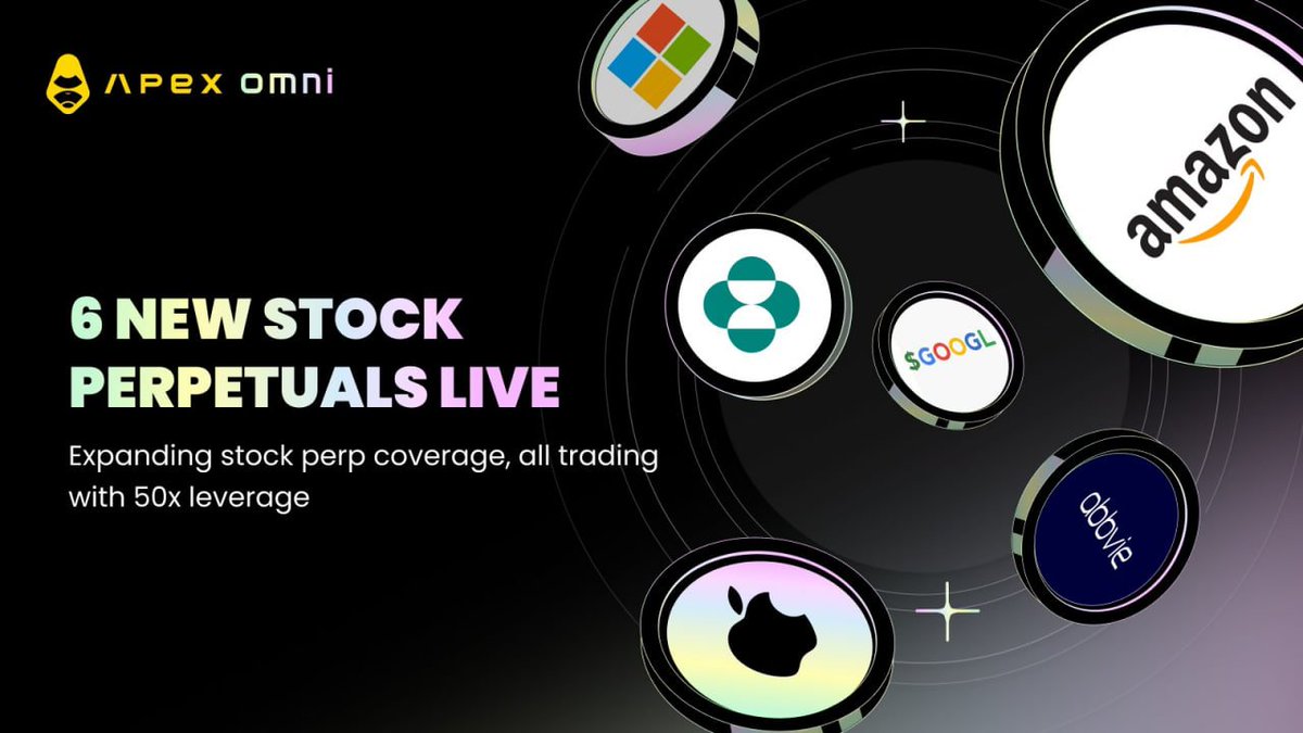 #ApeX 来了一波挺猛的更新一口气上了 6 个新的股票永续。 MRK、ABBV、MSFT、GOOGL、AMZN、AAPL 六大美股巨头,全部一次性放开,而且最高还能直接开到 50x。 本来他们才 5 个 stock perps,现在直接涨到 11 个,等于是科技、医药、电商、AI、硬件这些主赛道一次补齐。 说实话 @OfficialApeXdex 这段时间明显在把美股永续当主线做了:用上 Chainlink 之后,喂价速度快了,扩标的的节奏也跟着拉上来了。你以前要开美股仓,还得跑传统券商、填资料、等审核;现在链上一打开,就是苹果、亚马逊、微软随你做。 对本来就在做 crypto perp 的人来说,感觉就像突然多开了一扇门:交易逻辑不变,但可以碰到的市场大了不少,而且都是你平常就在看的那些美股大盘公司。 说到底 @ApeXProtocolCN 正在把加密永续这套玩法,直接延伸到更大的市场里。 @KaitoAI #KaitoYap #Yap $APEX #ApeXOmni #zkLinkX