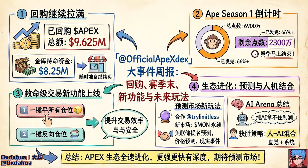 @OfficialApeXdex」大事件周报: 回购继续拉满,ApeX目前已经回购了 $9.625M 的 $APEX 另外还有 $8.25M 已经装在金库里,随时准备继续买。 Ape Season 1 马上结束了 整个赛季 6900 万点数,现在只剩 2300 万。 等于 66%+ 发完了 并且还会更新两个救命级的交易功能上线 1⃣ 一键平所有仓位 2⃣ 一键反向仓位 ▰▰▰▰▰▰▰▰▰▰ 和@trylimitless的合作,加上 $MON 永续、两位美联储主席提名预测这些新市场,感觉之后的玩法方向越来越明确了。 现在 ApeX 要跟他们联手 ,价格预测、现实事件都会开。 AI Arena 的结果我必须说一下,官推的总结非常真实: 纯 AI 真的赢不了,因为AI平仓太快拿不住利润,原始数据也不好用。 最后获胜的是人+AI的混合策略,其实这和我们平时交易很像,直觉和系统,两个都不能少 ▰▰▰▰▰▰▰▰▰▰ ApeX也正在全速的把自己的交易生态做的更强更快更有深度,从功能到预测市场,再到 $APEX 价值捕获。 总之我最期待的就是ApeX预测市场的玩法。 @ApeXProtocolCN $APEX @KaitoAI #KaitoAI
