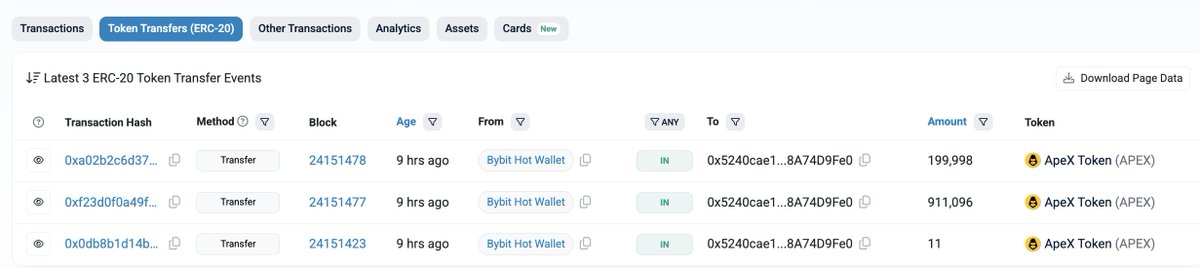 Two newly created wallets(0x5240 & 0x387c) withdrew 2.08M $APEX($1.06M) from #Bybit 9 hours ago.