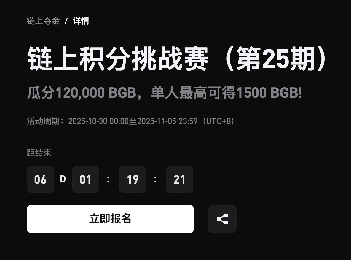 今天刷 #Bitget 活动页时,看到第25期链上积分挑战赛又开了。说实话,这个系列我已经跟了好几期了开始只是想碰碰运气拿点 $BGB ,现在反而养成了一个习惯。