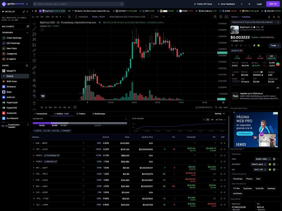 I was watching $BigTrout on Solana today. Price was spiking fast, and social chatter made it look like a no-brainer pump. → Before touching the buy button, I opened GeckoTerminal and went straight to the Holders Tab. What I saw made me pause: most of the volume was concentrated in a handful of wallets. → Top 3 addresses held over 15% of circulating supply, and one of them had been moving coins in the last hour. That’s the kind of detail you can’t get from a standard price chart… Next, I checked the Solana pool liquidity and transaction history. Sure, it was pumping, but depth was shallow: only ~$10k in the last 24h. → The difference was clear: GeckoTerminal turned a moment of FOMO into a measured decision. Checking the tool added a layer of confidence and saved me from catching a falling knife. Every single trade I made now starts here. If you’re serious about trading, skipping these insights is leaving information on the table!