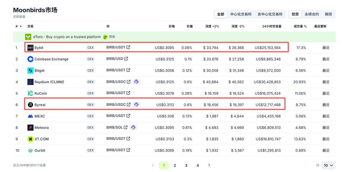 你知道现在Bybit+Byreal这个组合在SOL生态上有多离谱嘛? 拿最近上线的 $BIRB 为例子。 根据CoinGecko的数据显示 $BIRB 的三分之一的交易量都来自Bybit+Byreal Byreal @byreal_io 作为DEX 其 $BIRD 的交易量已经超过了部分二线交易所。 我觉得跟他们推出的USDC-BIRB 池子有关,池子年化高达1500%左右。 之前我看到 @toly 问过Solana 最大的挑战是什么? 当时我看了评论区,大部分都是说 Solana上没有自己的CEX 而最近无论是Byibt 还是Bybit Alpha 还是Byreal 一直都紧跟SOL生态。 比如: $SKR $WhiteWhale $PENGUIN 既然这样的话,有没有可能两家达成合作形成互补?