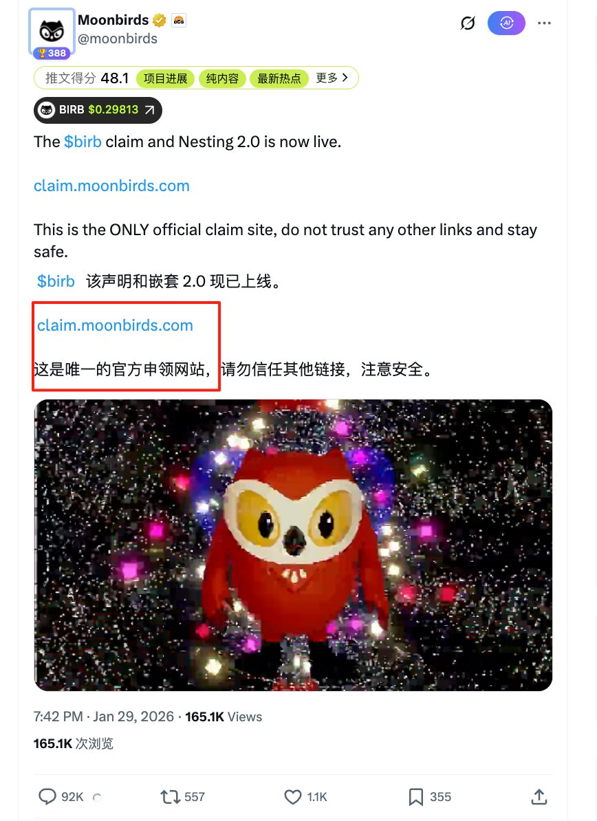 月鸟空投还没领的先别领,社区有人反馈领了之后 $birb 又立马被转走,不确定是被盗了还是啥情况 有人说这是官方小游戏导致的,根据小游戏规则会强制分配你的代币到游戏角色里面。 目前也不知道具体啥情况 总体感觉就是月鸟技术不够又要整那么多花样,玩砸了,再等等看吧,干脆简单的空投不好么