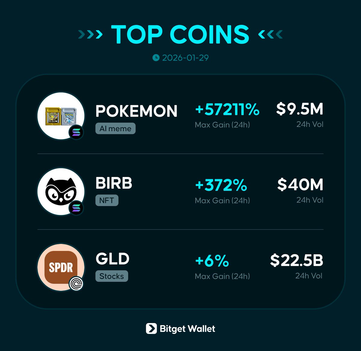 Today's top picks: 👾 Memes: $POKEMON 🦉 Memes: $BIRB 📊 Stocks: $GLD Markets outlook: Market tumbles while gold & silver hit new highs. Moonbirds cooked hard with $BIRB.
