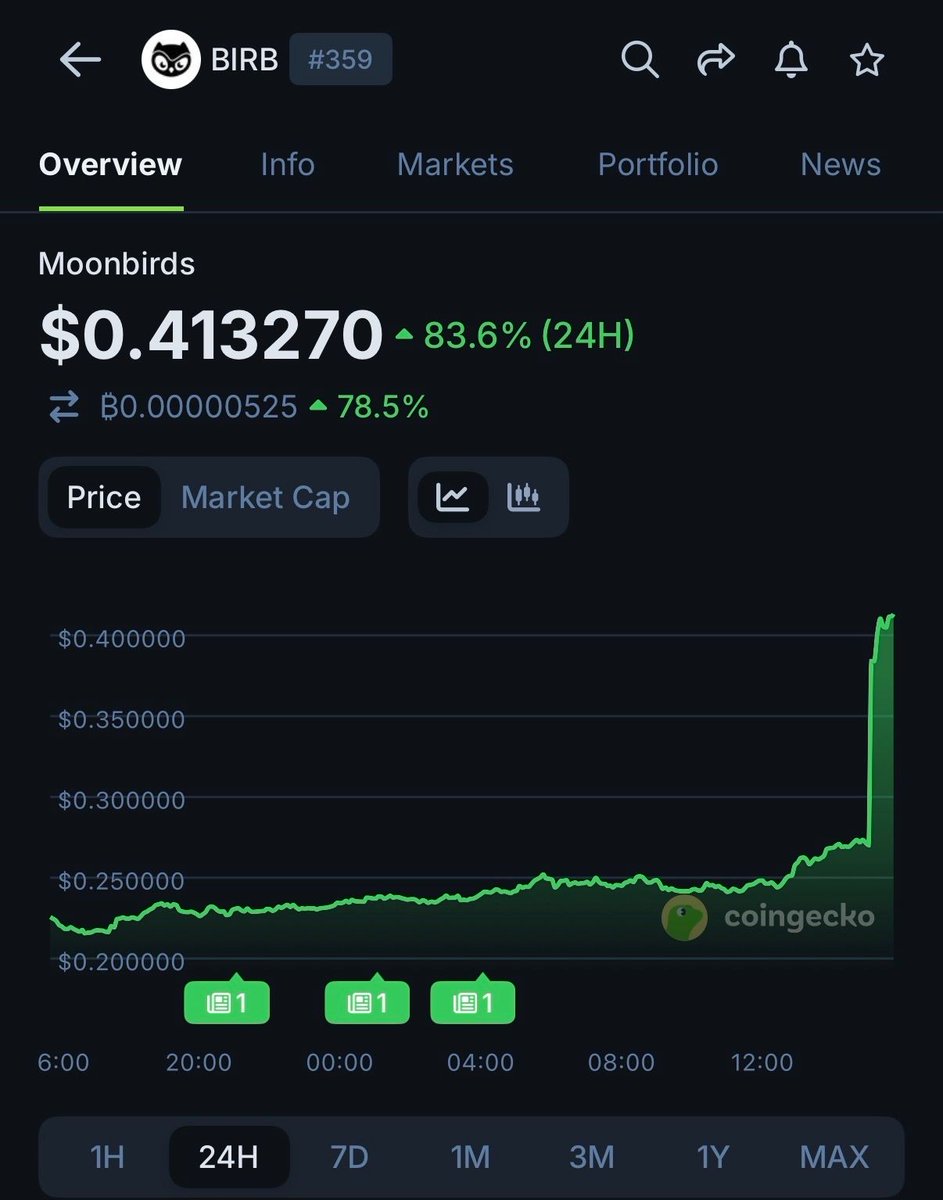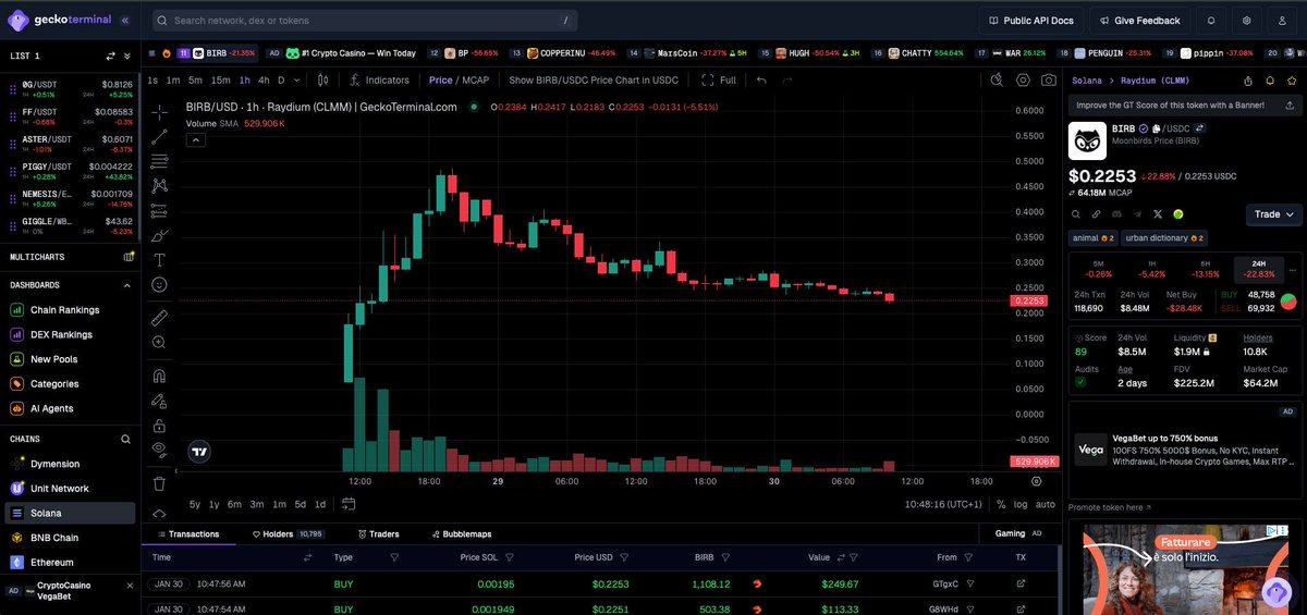 Noticed $BIRB climbing in @GeckoTerminal’s trending categories and watched closer. First things that kept my attention were: 1M+ txns and volume climbing fast. Pulled up the pool chart on Solana → saw $8.4M 24h volume and a net buy wall forming. CLMM data confirmed tight LP bands as price was coiling between $0.22–$0.24 with low slippage and high liquidity depth. Trade history was 80% green with buyers pushing size into a shallow sell book. So, entered pre-breakout, managed position using real-time txn feed and GT score/liquidity tab. Without GeckoTerminal surfacing the trend + showing clean liquidity alignment, I’d have missed the trade completely.