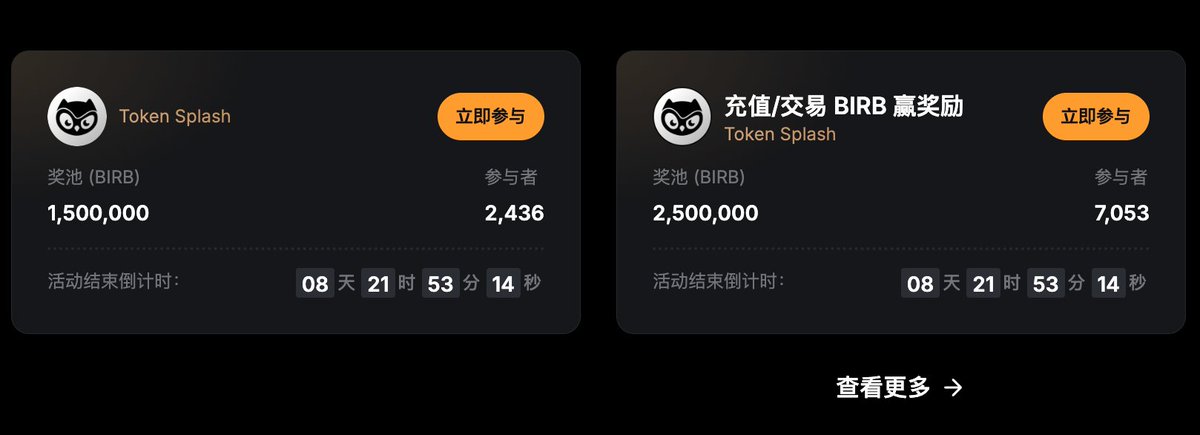 Moonbirds 这波,直接让Bybit Token Splash 再次出现大毛,上一次还是FIGHT、Seeker。 🔸随着 $BIRB 单日涨幅接近 100%,这期 Bybit 的 Token Splash 奖池规模总价值已经到约 130 万美元。 🪙奖池结构很清楚: 4,000,000 BIRB分两个池(新户独占1,000,000),更关键的是,当前参与人数不足 1 万人。 也就是说,在这 8 天周期里,人均对应收益大约在 130 美元水平。当然这是平均数:交易量大的拿得多,交易量小的拿得少,不少人随便刷个 500 USDT 交易量就能分一杯羹。 🔸但至少可以确认一件事——这不是那种几十万人挤一个池子的活动。 ✅从参与体验上看也很直观:如果你本来就有 $BIRB 的交易需求,那 Token Splash 更像是:在不改变交易行为的前提下,多了一层额外回报。 币价上涨的过程中,奖励的美元价值同步被放大,这也是为什么最近很多人开始重新算这笔账。现在参与人数还不足9500,明天估计就一万五了。 🔗1,500,000 BIRB 奖池:https://t.co/AgfutyAOko; 🔗2,500,000 BIRB 奖池(含新户:1,000,000)https://t.co/mxwk6blaOW ✅整体就一句话总结: $BIRB 这波,不只是价格在涨,Bybit 这边的 Token Splash,收益是能算清楚的。 这种情况,不常见。