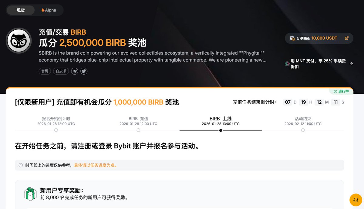 兄弟们以后要多关注和参加Bybit的活动了,实在是太猛了 不知道大家发现没有,最近SOL生态项目 Moonbirds、Seeker、FIGHT 几乎都是 Bybit + Byreal 这条路再加上 Coinbase, Robinhood 自带欧美所,不管是流动性还是币价走势,目前来看效果都挺不错的,可以看出 Bybit @Bybit_Official 和 SOL 生态关系越来越紧密,以后再也不用担心 SOL 生态代币上市得不到大所支持,优质项目的机会会越来越多。 月鸟 $BIRB TGE 之后,Bybit 直接上线现货+合约+Alpha,今天又上了韩所 Upbit 韩元交易对 ,一度爆拉 80%。大家应该也有注意到Coinbase 全面接入了 Jupiter 支持交易 Sol 资产(用的是三方的服务),但Bybit 和 Byreal 已经深耕 Sol 生态项目很久了,BIRB 代币 Byreal 交易量占全网 8%,Bybit + Byreal 一起能占到一半的交易量,后续大家可以多多留意参与Byreal上新 最后说一下 Bybit Token Splash 活动,共 2,500,000 + 1,500,000 $BIRB 代币奖池,前 8,000 名完成任务的新用户可获得125 $BIRB 奖励,至少充值 500 BIRB或充值 100 USDT 并买入 100 USDT 等值 BIRB 以完成首次现货交易,老用户报名参加活动完成至少 500 USDT 等值的 BIRB 现货交易最高可得 3500 BIRB https://t.co/iMXPsjUjtJ