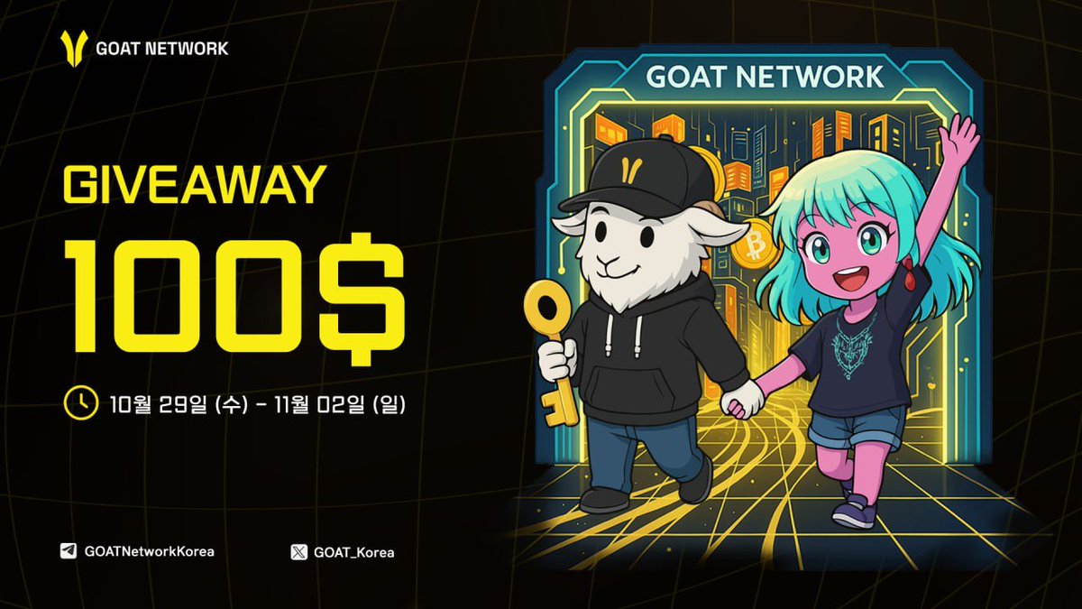 🎉 GOAT KOREA x KOOB 콜라보 100$ 에어드랍 이벤트 @GOAT_Korea 🚀 GOAT Bridge 업그레이드 완료! $BTC, $BTCB, $DOGE 도 쉽게 브릿지 후 바로 BTCFi 생태계에서 수익 시작 가능🔥 @ArtemisFinance @AvalonFinance_ @StableJack_xyz @Pell_Network 🎁 리워드: 총 100$ (랜덤 5명, 각 $20) 1️⃣ @GOATRollup + @GOAT_Korea + @kimyg002 팔로우 2️⃣ 이 글 좋아요 + 댓글 + RT or QT(인용) 3️⃣ 텔레그램 한국채팅방에서 “ LFGOAT ” 작성 ⏰기간: 10월 29일 (수) - 11월 02일 (일) 이제 GOAT와 함께 BTCFi 파밍 가즈아~!! GOAT, 한국 텔레그램방 링크는 댓글에 남겨둠