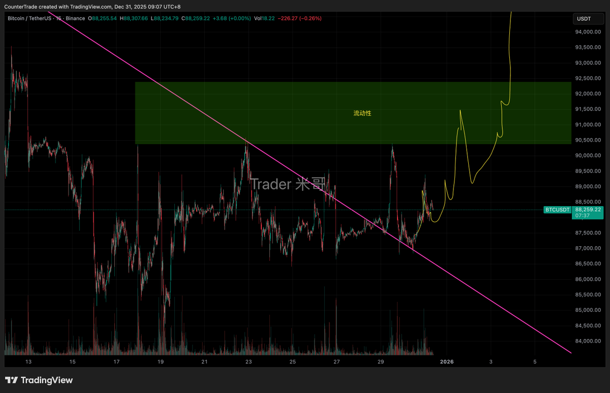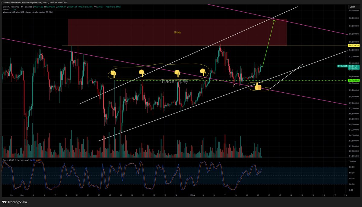 从这里,我看涨到98-99k。那个位置是我们期待已久的结构性趋势线。这里我强烈看涨。就像我87k强烈看涨一样。
