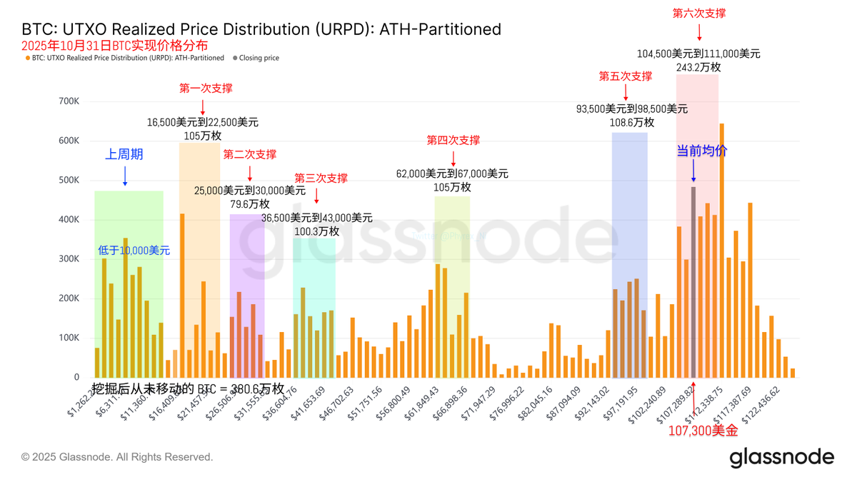 虽然短期投资者的情绪并不是很好,但筹码结构显示多数的投资者仍然是非常稳定的,104,500 美元到 111,000 美元之间的支撑也非常稳固,最近几次向下插针都显示出了这个位置的强度。