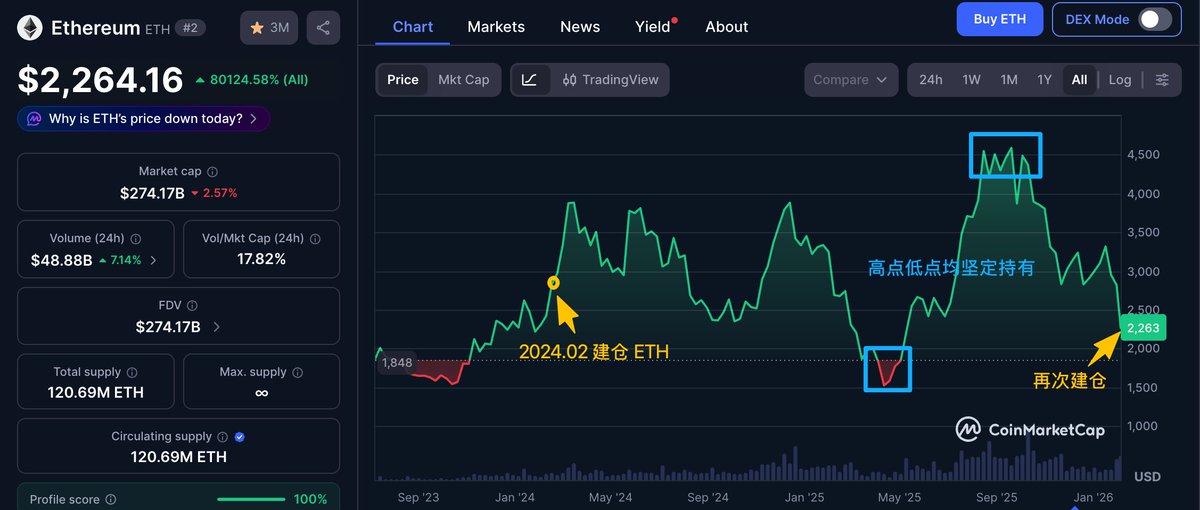 然而 7 小时前突然以均价 $2174 在链上买入 4020.61 枚 ETH(价值 874 万美元),目前共持有 5122 ETH,平均成本 $2269,与现价基本持平
