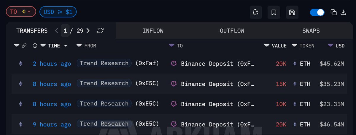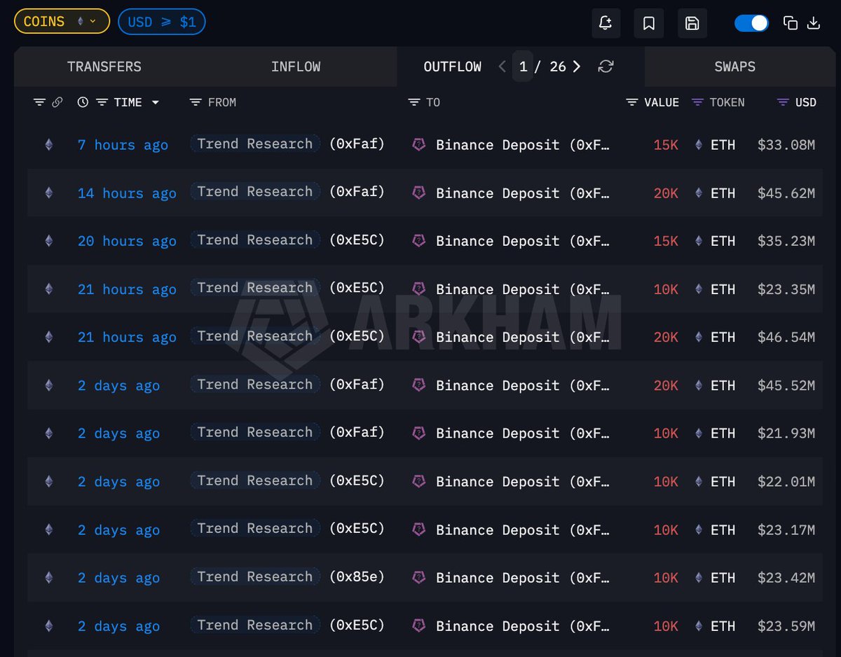 Trend Research 过去 14 小时向 #Binance 充值 3.5 万枚 ETH,自 02.01 以来累计卸杠杆疑似卖出的 ETH 数量高达 16 万枚,总价值 3.67 亿美元,预计实质性亏损 1.28 亿美元(成本 ~$3,104.36,充值价格 $2298.91),当前仍剩余 49.8 万枚 ETH