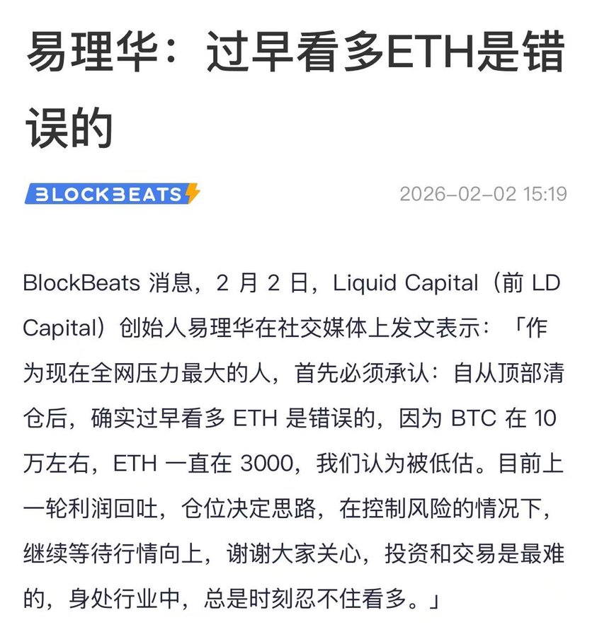 目前易老板已总亏损达6.05亿美元(已实现亏损1.36亿元,未实现亏损4.69亿),易理华旗下 Trend Research 两日抛售约 23.5% 的 ETH 持仓。