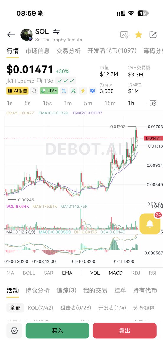 看到很多人在庆祝在sol上赚到钱了 什么 $fish 啊 114514啊. 我一个都看不懂 所以一个也没赚到,倒也问题不大,至少不用亏了 最近玩合约和alpha的多一点 昨天的 $esim 以为会低开 结果开盘也不低,但是犹豫了一下还是上了 开始赚了25%没跑,最后被洗成狗 好在现在拉回来了,没把我洗走 一开始上是觉得看走势是还想有下一步 中间一洗给我洗懵逼了 但是现在拉回来了,我又觉得要下一步了 今晚的 $brev 给我空投了483个币 现在盘前合约的价格0.44 还是那个观点,外面筹码很多 等开盘砸玩再看 主要是向上好像也不知道是什么预期了