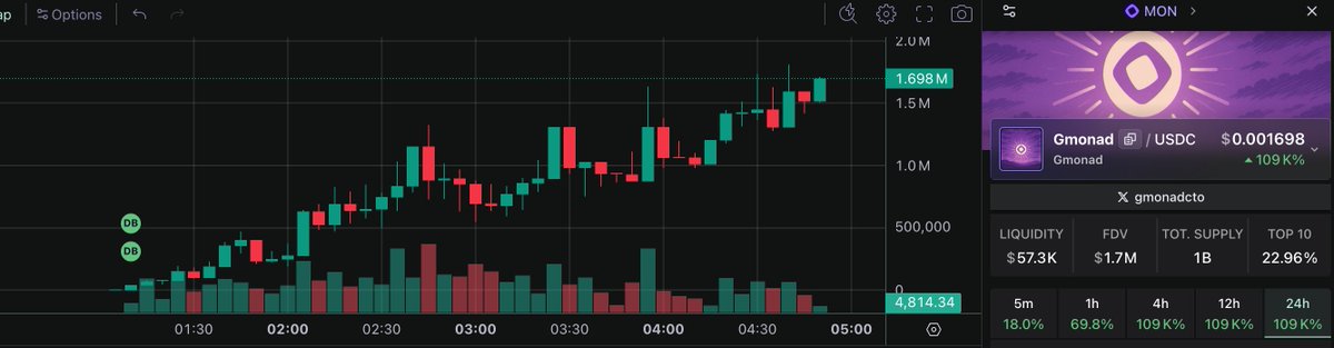 抱着试试看的心理,去Monad链买了个 $gmonad ,运气好涨了五倍至243K市值。😯 我看这条新链的热门meme, $nads 也涨到了1.7M。 感觉有些资金进来。 先看 $gmonad 空间多大?帮我看看 CA:0xbb97e5ec82c4febf60f881cc8f489c16dd597777 直达扫链打狗平台、看线: #Monad