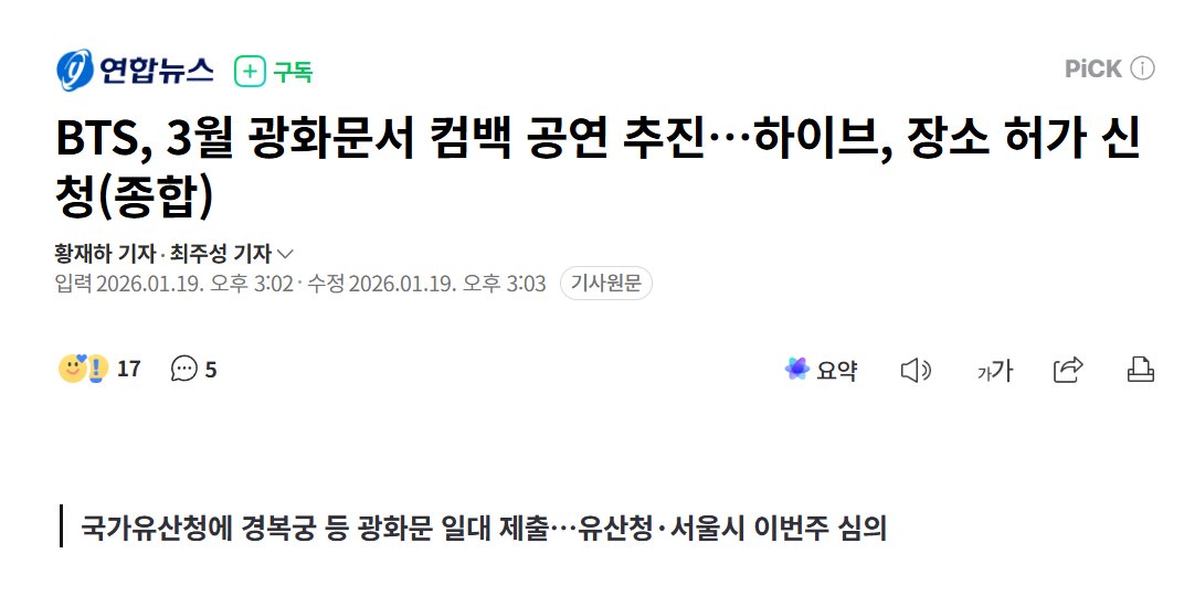 하이브 관계자는 이날 연합뉴스에 "현재 (광화문 일대 공연을) 논의 중이며, 장소와 일정 등에 대해 최종 결정되면 공식으로 안내할 예정"이라고 밝혔다.