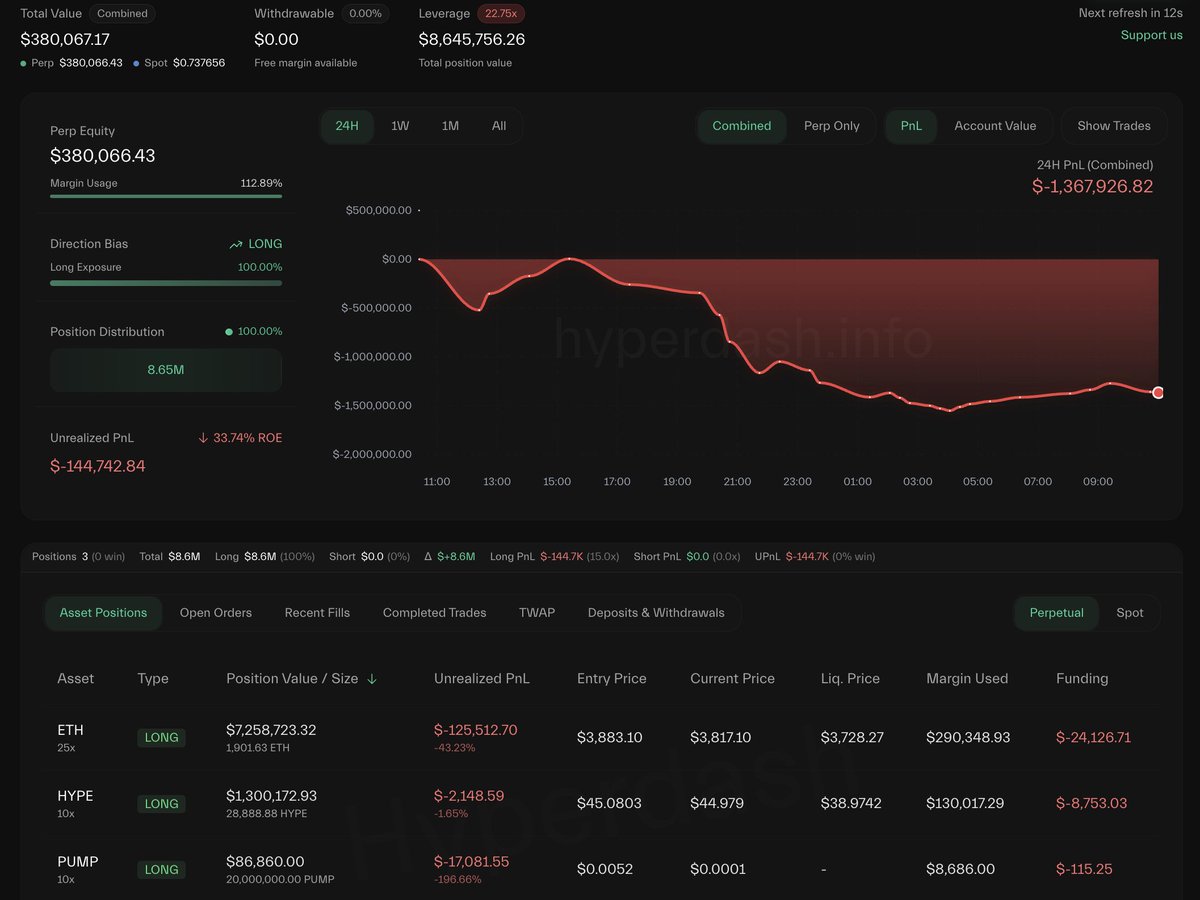 After multiple liquidations, he just deposited another 13,937 $USDC to keep longing $ETH and $HYPE.
